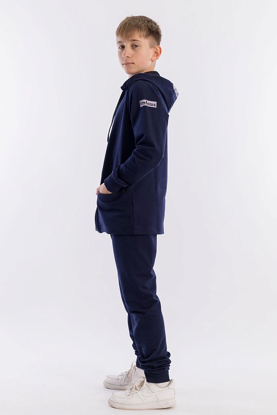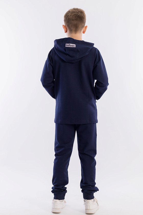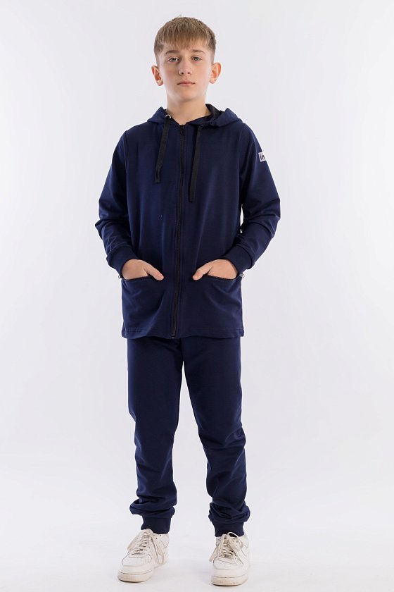 Костюм выполнен из футер петли с лайкрой. Толстовка и карманы на ней с застёжкой на молнию. Пояс и манжеты на брюках и рукавах из кашкорсе. Ширина капюшона регулируется при помощи шнура. На рукаве и капюшоне нанесён термопринт.