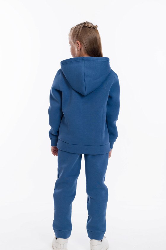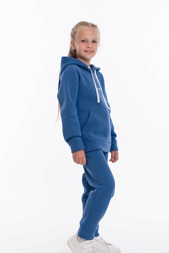Толстовка имеет удобный крой с карманом-кенгуру и принтом спереди, что придаёт костюму стильный вид. Пояс на талии, низ рукавов и низ брюк оформлены мягкими манжетами из основного полотна, что обеспечивает комфортную посадку и сохраняет тепло.