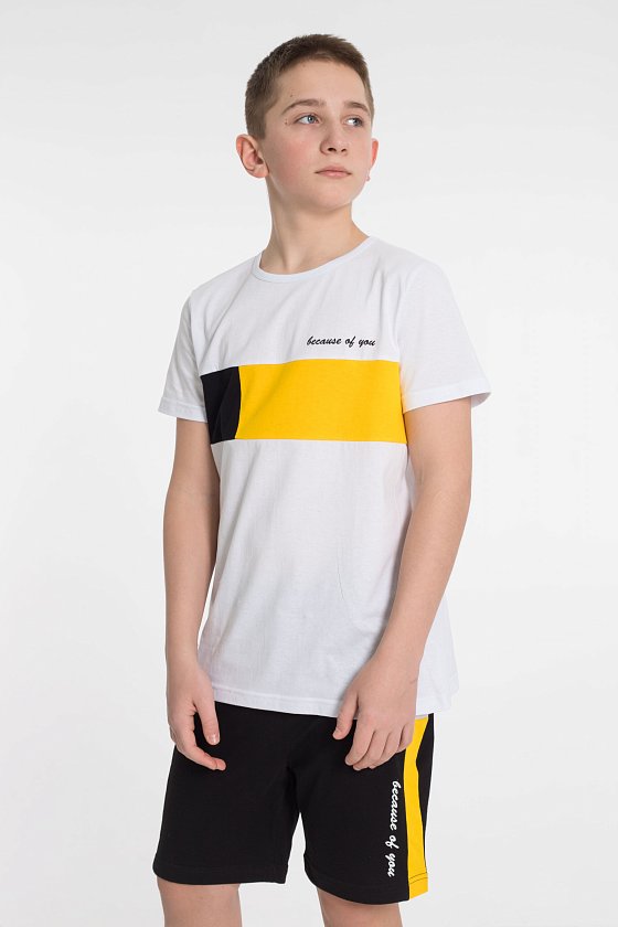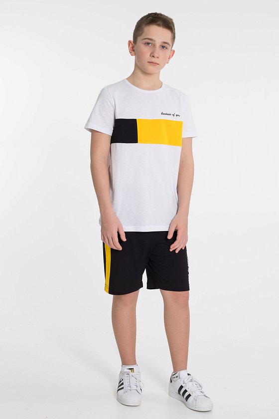 На кокетке футболки и правой передней половинке шорт принт.