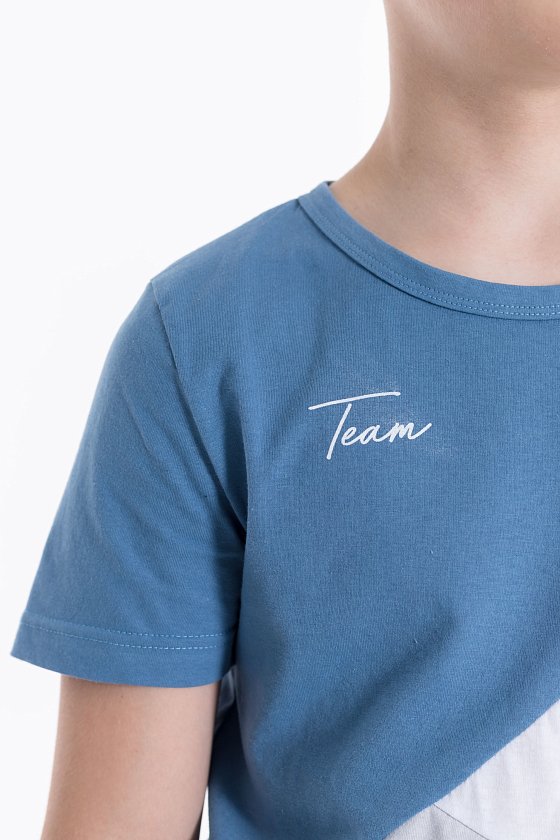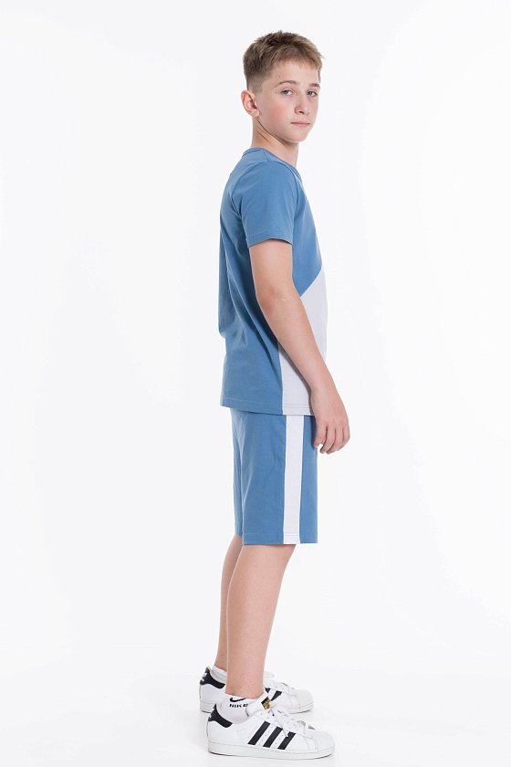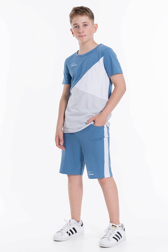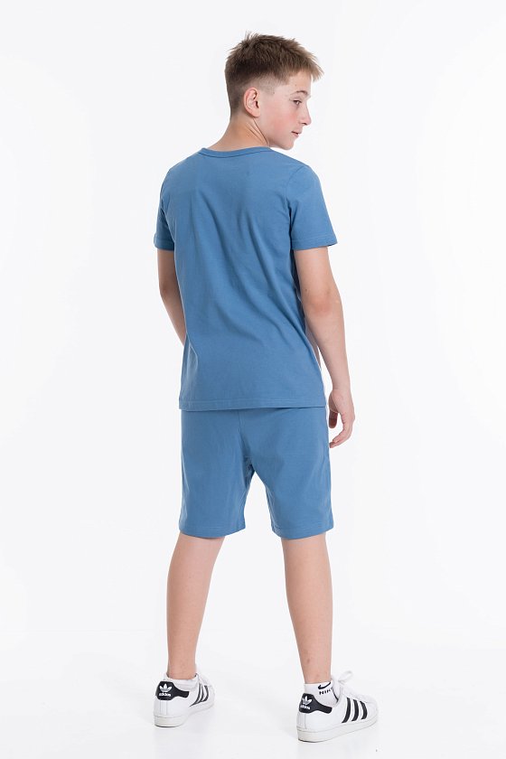Костюм выполнен из хлопкового полотна, состоит из футболки и шорт. Футболка прямого силуэта, круглый вырез горловины оформлен бейкой, рукав короткий. С левой стороны нанесён принт. Шорты с принтом, поясом на резинке и карманами по бокам.