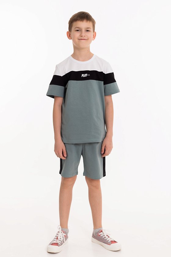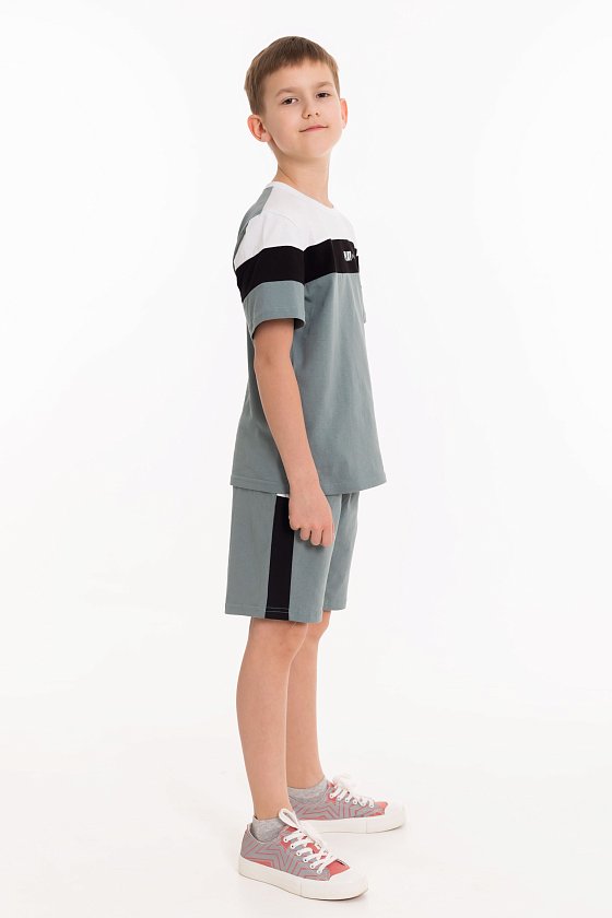 Костюм для мальчика выполнен из кулирки, состоит из футболки и шорт. Футболка с круглым вырезом горловины и принтом спереди. Шорты с поясом на резинке.