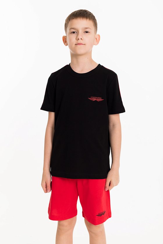 Костюм выполнен из однотонной кулирки двух цветов. Футболка с коротким втачным рукавом и круглым вырезом горловины. По плечевым участкам футболки широкие лампасы в цвет шорт. На футболке и шортах нанесён принт. Шорты свободные с боковыми карманами и притачным поясом на резинке.