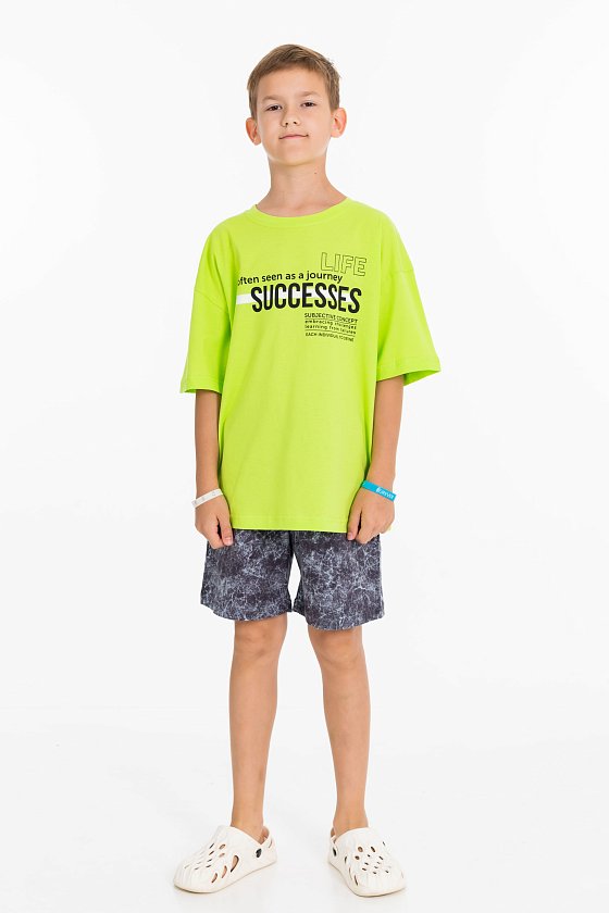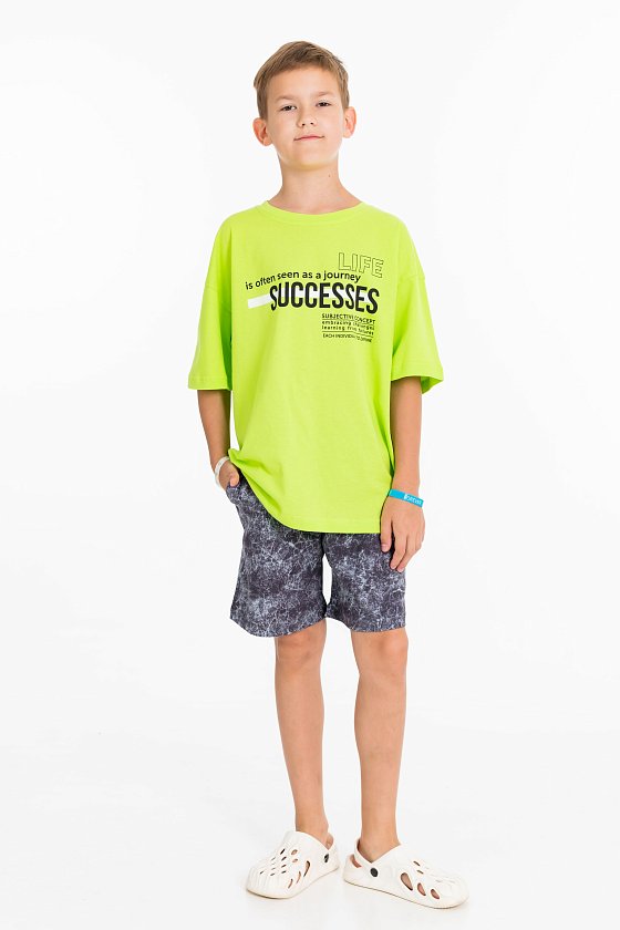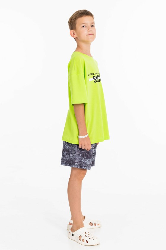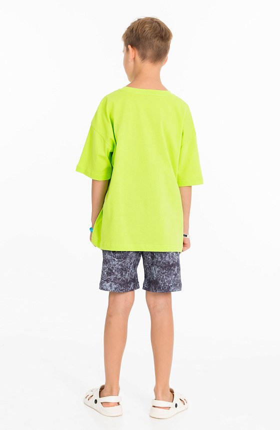 Костюм выполнен из хлопкового полотна. Футболка свободная, со спущенным рукавом и принтом спереди. Шорты свободные, с поясом на резине и боковыми карманами.