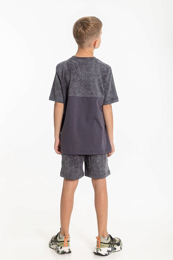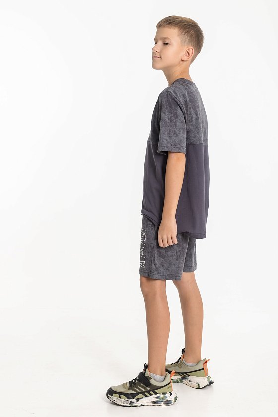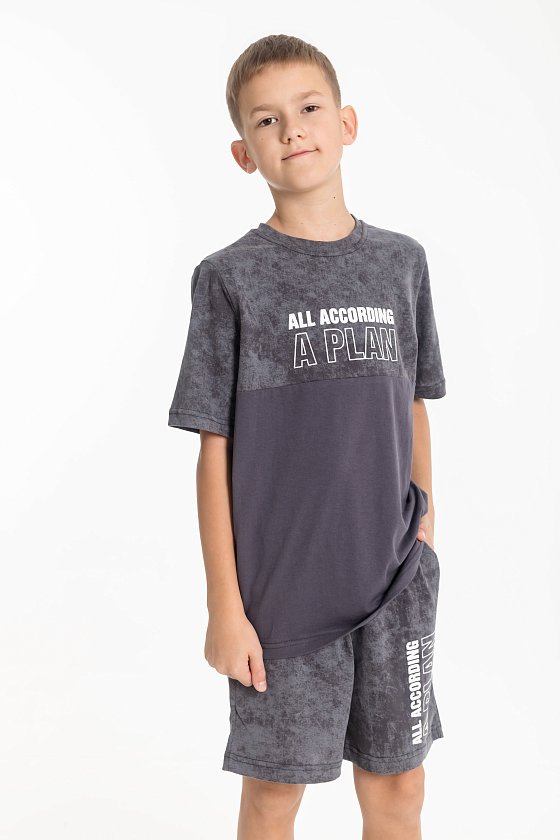 Костюм для мальчиков выполнен из кулирки, 100% хлопок. Футболка с круглым вырезом горловины, оформленным планкой, рукав втачной. Спереди нанесён принт. Шорты с боковыми карманами и поясом на резинке.