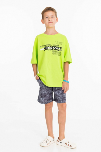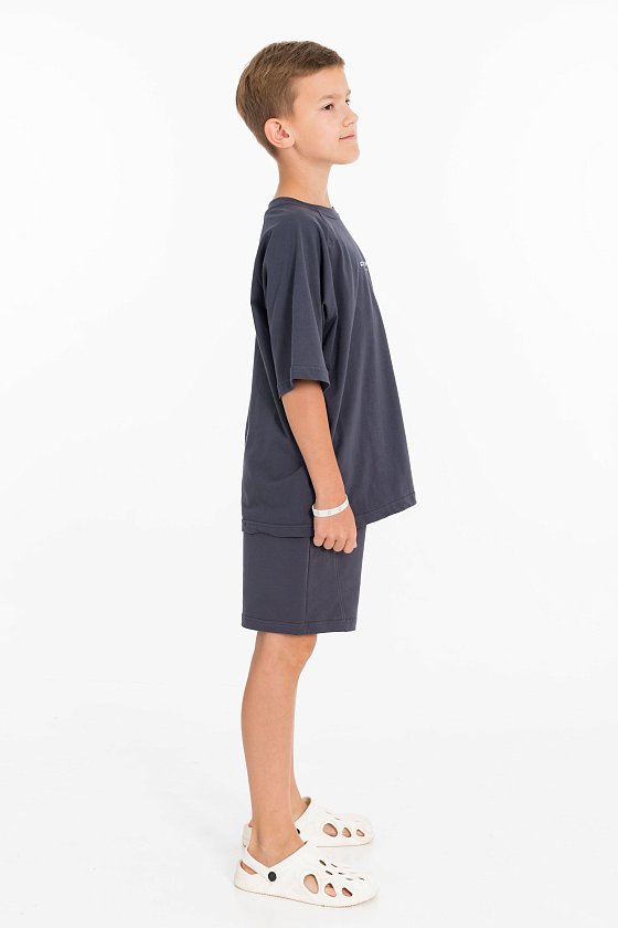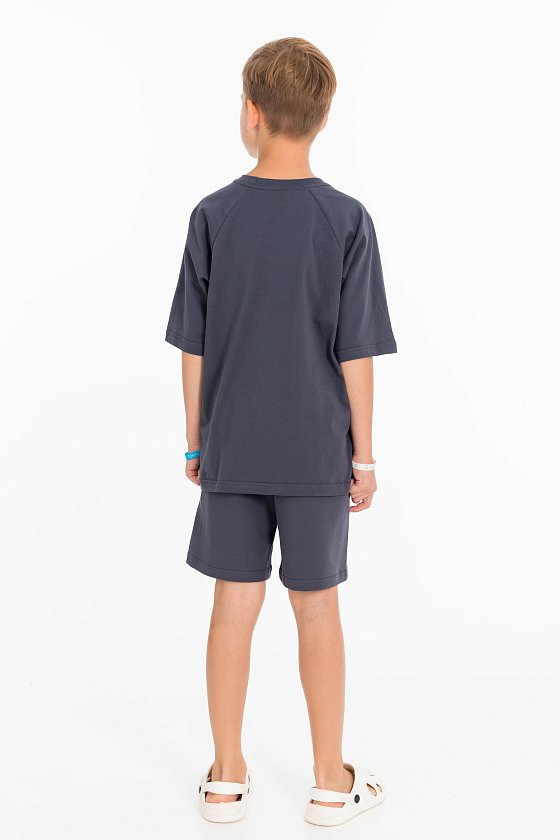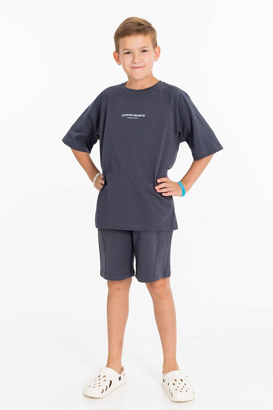 Костюм состоит из шорт и футболки. Футболка из однотонной кулирки, свободного покроя, с рукавами реглан. Шорты из однотонного футера,  с притачным поясом со шнуром и боковыми карманами. На футболке и шортах нанесён принт.