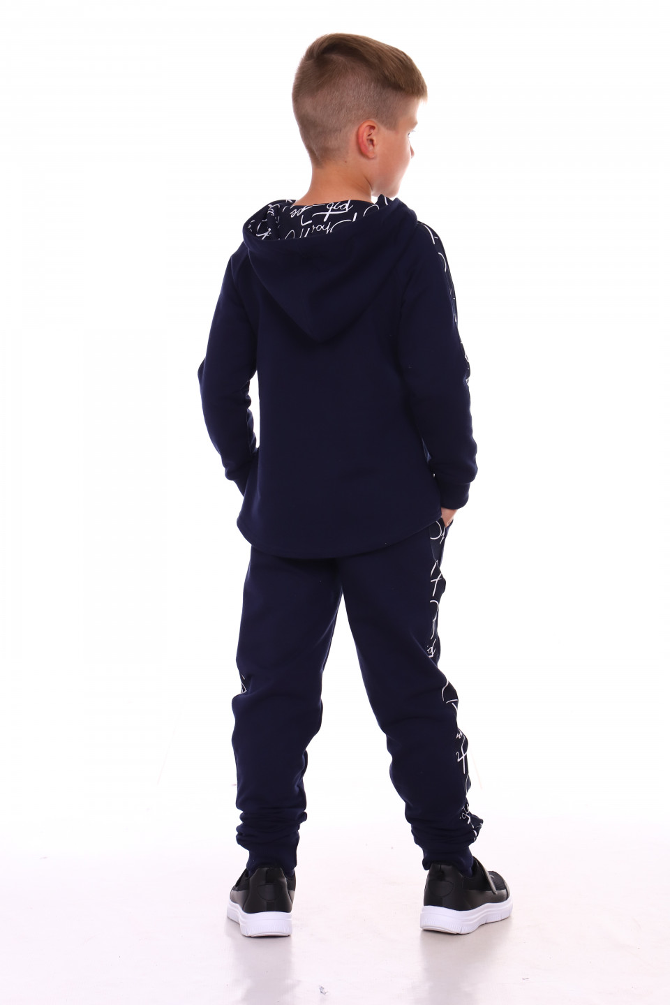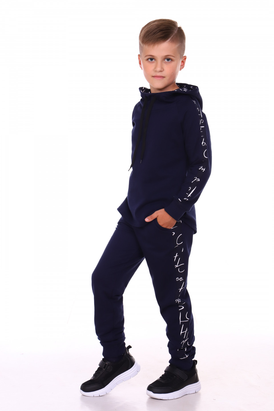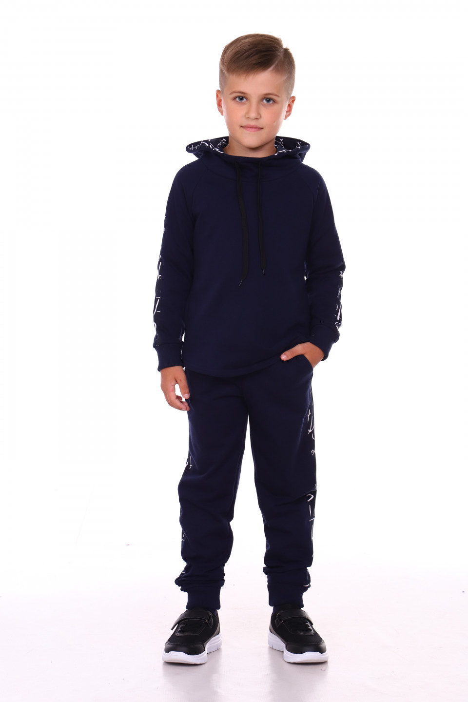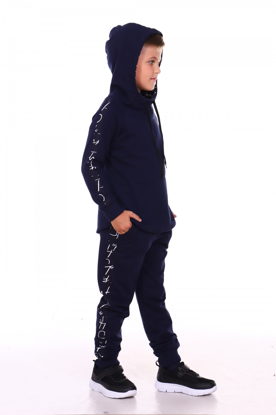 Детский костюм с капюшоном для активного отдыха. Брюки с лампасами из оригинальной ткани, немного заужены, низ на манжете, два удобных кармана. Толстовка оформлена из однотонной ткани, по бокам на рукавах вставки. В капюшоне есть два утягивающих шнурка для защиты от ветра.