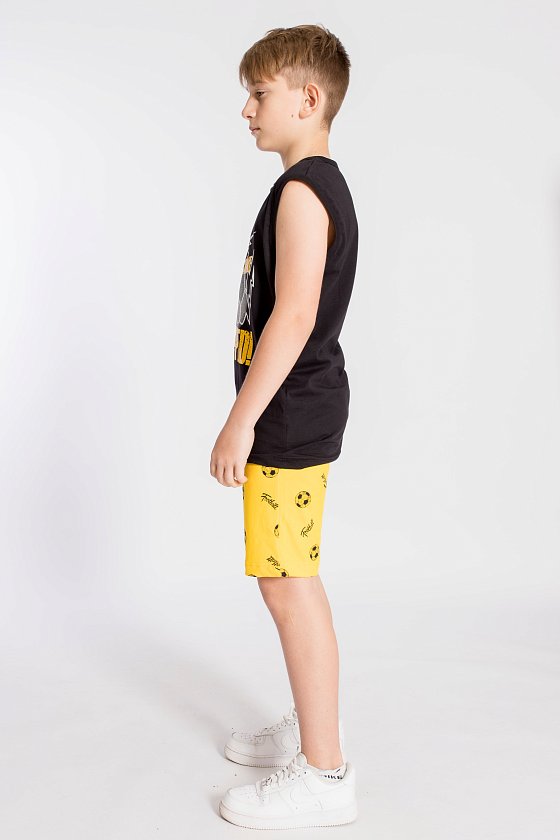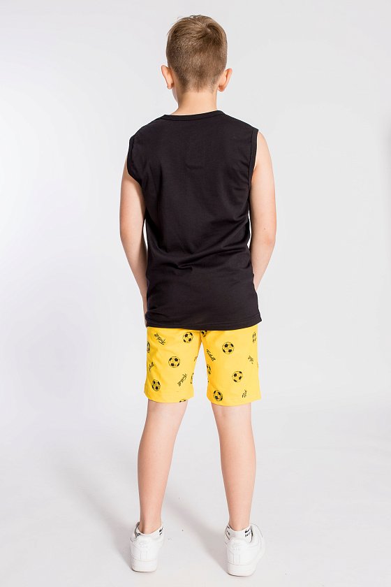 Костюм для мальчика выполнен из кулирки, состоит из шорт и майки. Майка однотонная, с принтом спереди, проймы и горловина обработаны бейкой. Шорты из полотна с набивным рисунком, пояс на резинке.