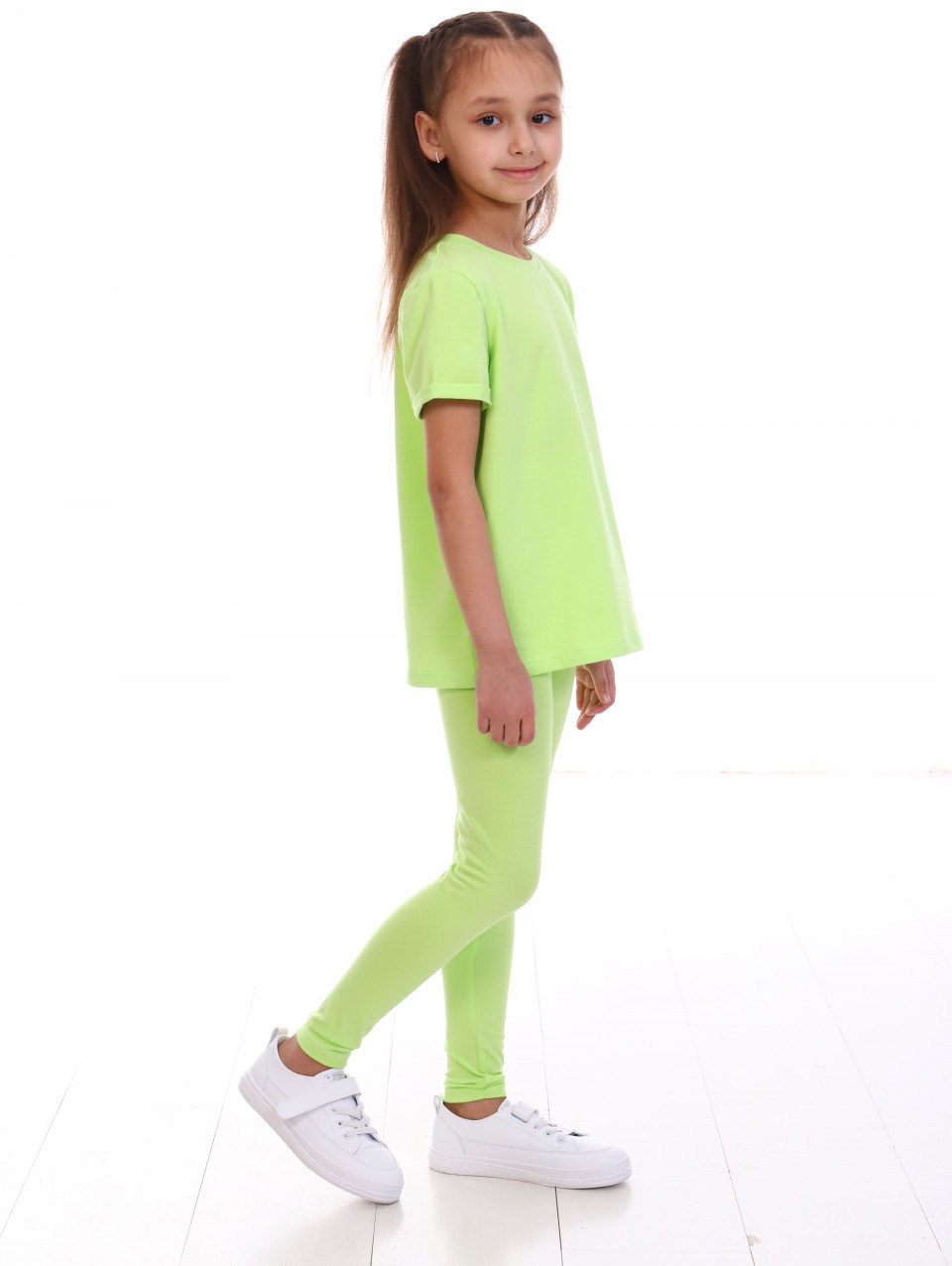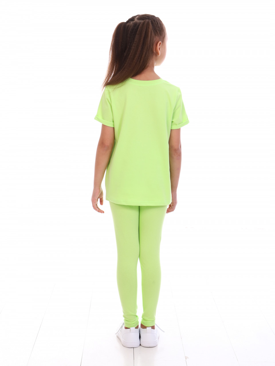Костюм для девочки футболка и лосины, выполнен из кулирки с лайкрой. Футболка прямого кроя с коротким рукавом, горловина округлая. Детские лосины из эластичной кулирки, по талии на резинке, облегают фигуру не сковывая движений.
