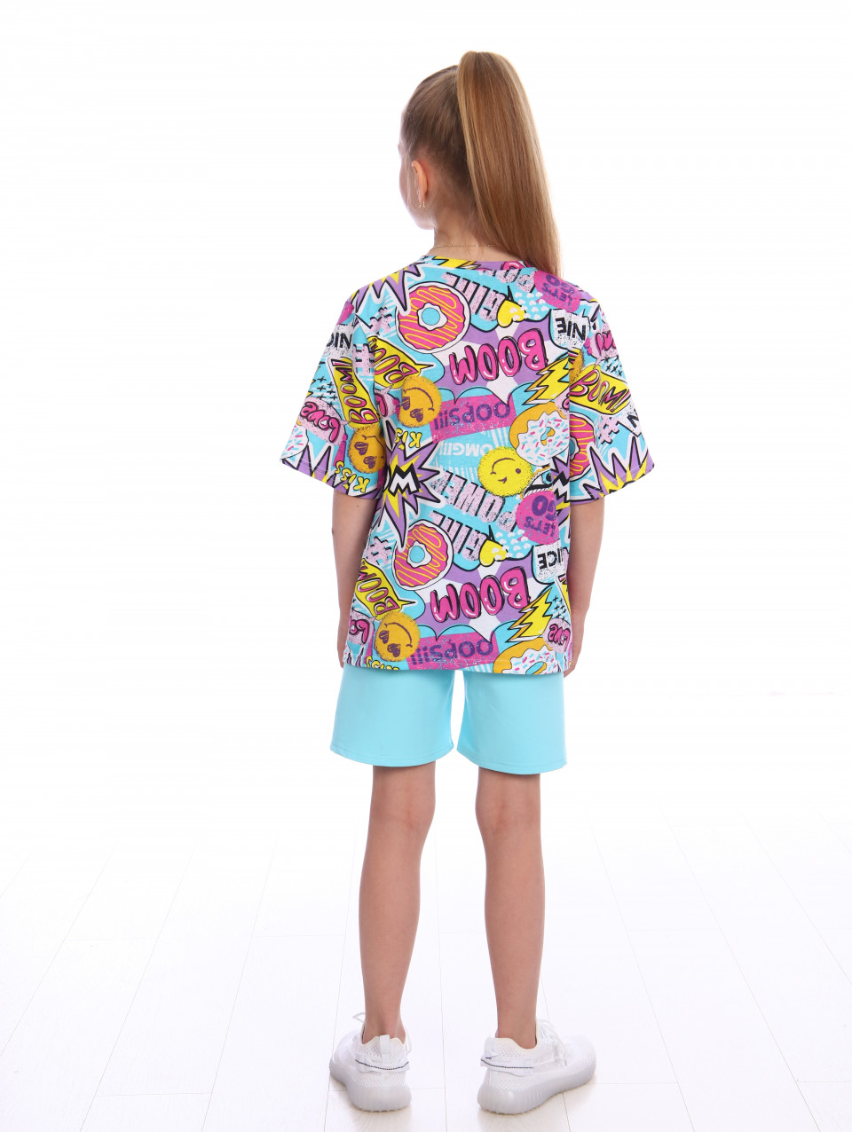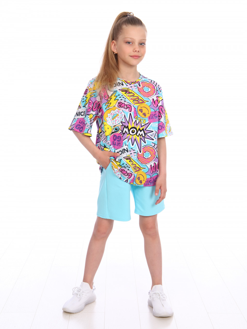 Летний костюм для девочки. Комплект детский состоит из футболки со спущенным коротким рукавом, округлой горловиной и шорт длиной выше колена. Футболка для девочки выполнена из 100% хлопка, яркое исполнение придаст образу оригинальности и необычности. Материал бридж - кулирка с лайкрой, штанишки немного тянутся. Костюм - отличный вариант на летний период, подойдет для отдыха, прогулок, дома и спорта.