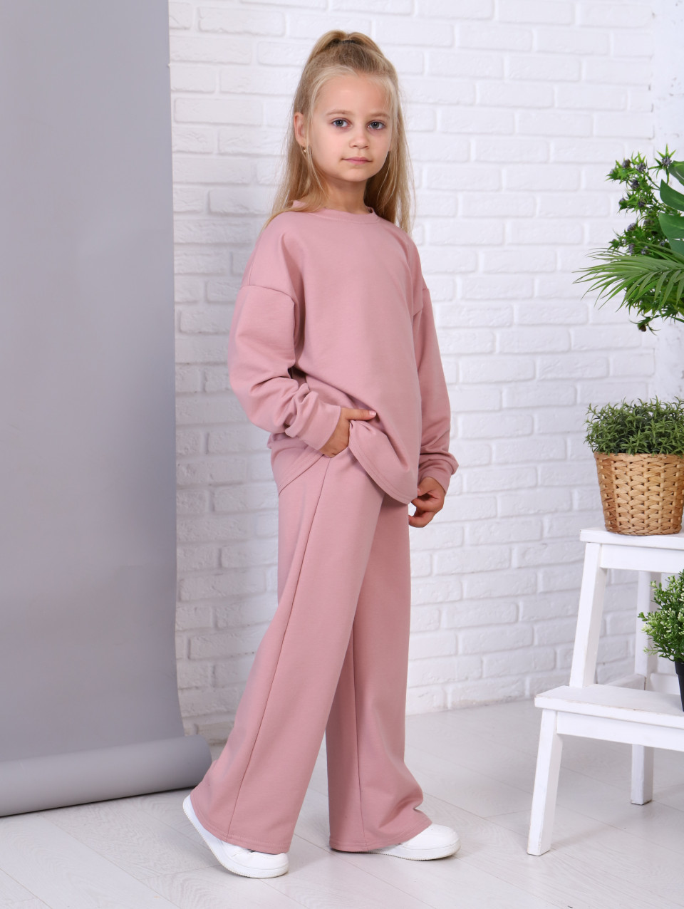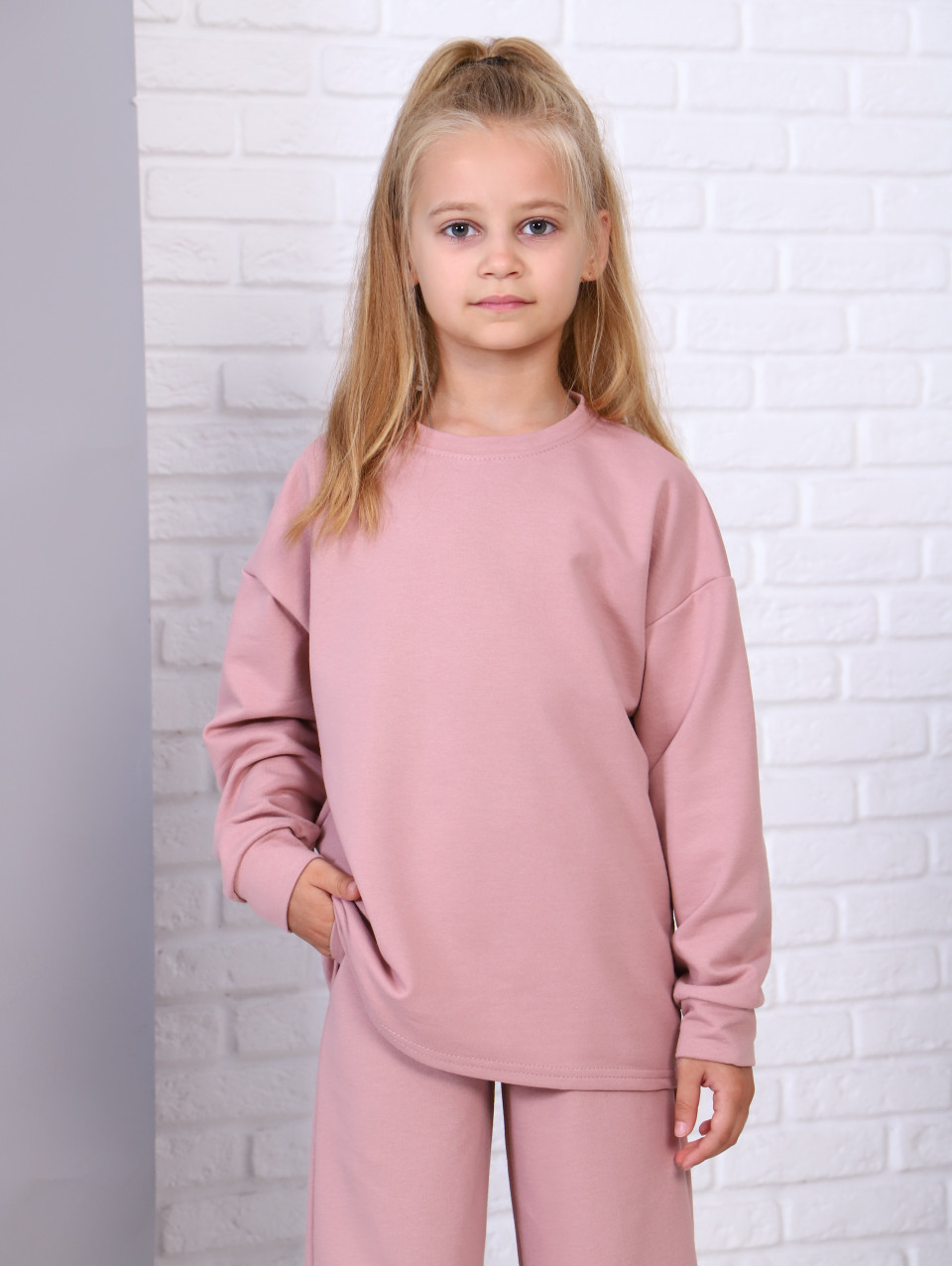 Детский однотонный  костюм для девочки из петельчатого футера. Подростковая толстовка со спущенной линией плеча, рукав длинный с манжетами, горловина кофты округлая. Удлиненные кюлоты имеют два кармана в боковых швах, брюки-трубы на резинке. Спортивный костюм прекрасно подойдет для прогулок, отдыха и дома, а также в качестве подарка.
