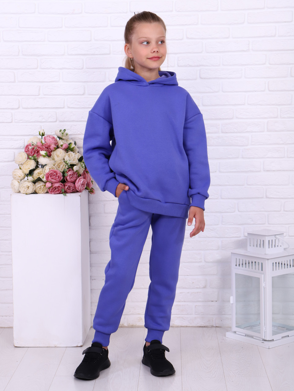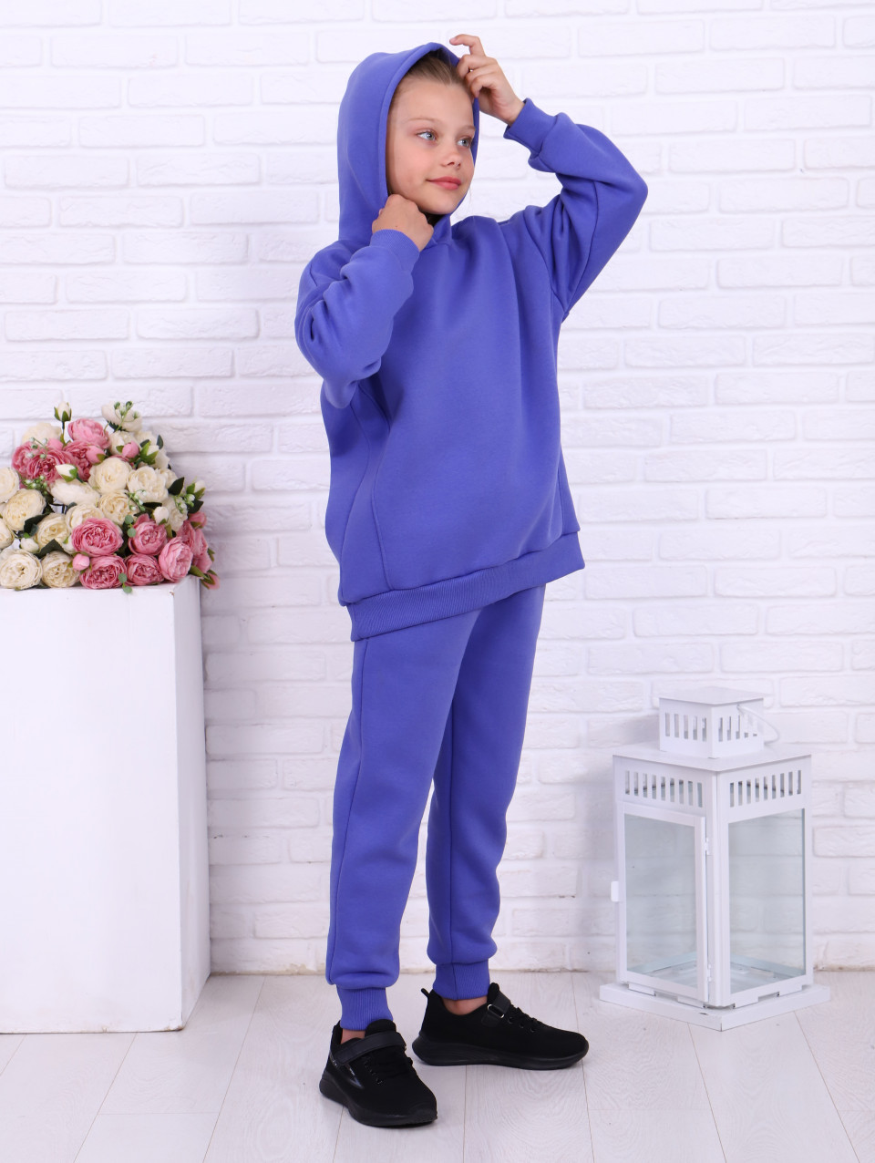 Модный спортивный костюм для детишек - очень теплый и приятный к телу. В нем Ваш ребенок будет чувствовать себя стильно и комфортно. Детская толстовка свободная с капюшоном, рукав худи спущенный с манжетами. Брюки прямого кроя снизу на манжете. Удобную посадку брюк обеспечивает поясная резинка. Такой костюм прекрасно подойдет для путешествий, зимних прогулок.