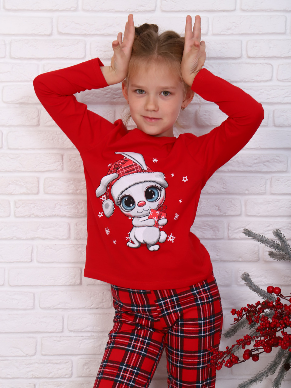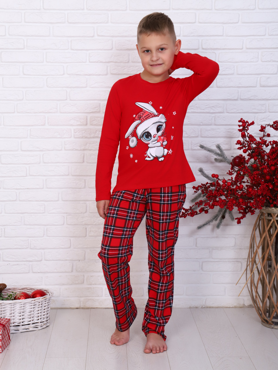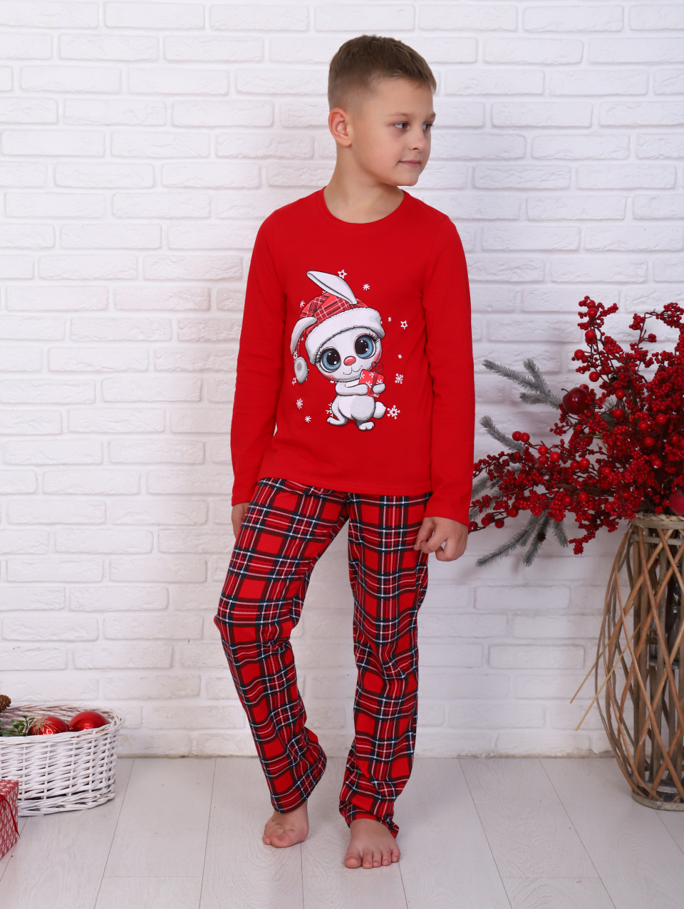 Новогодний домашний комплект для мальчиков и девочек. Детский лонгслив прямого силуэта, втачной длинный рукав. Брюки в клетку классического кроя, пояс на резинке. Костюм с символом прдестоящего года подойдет также в качестве пижамы.