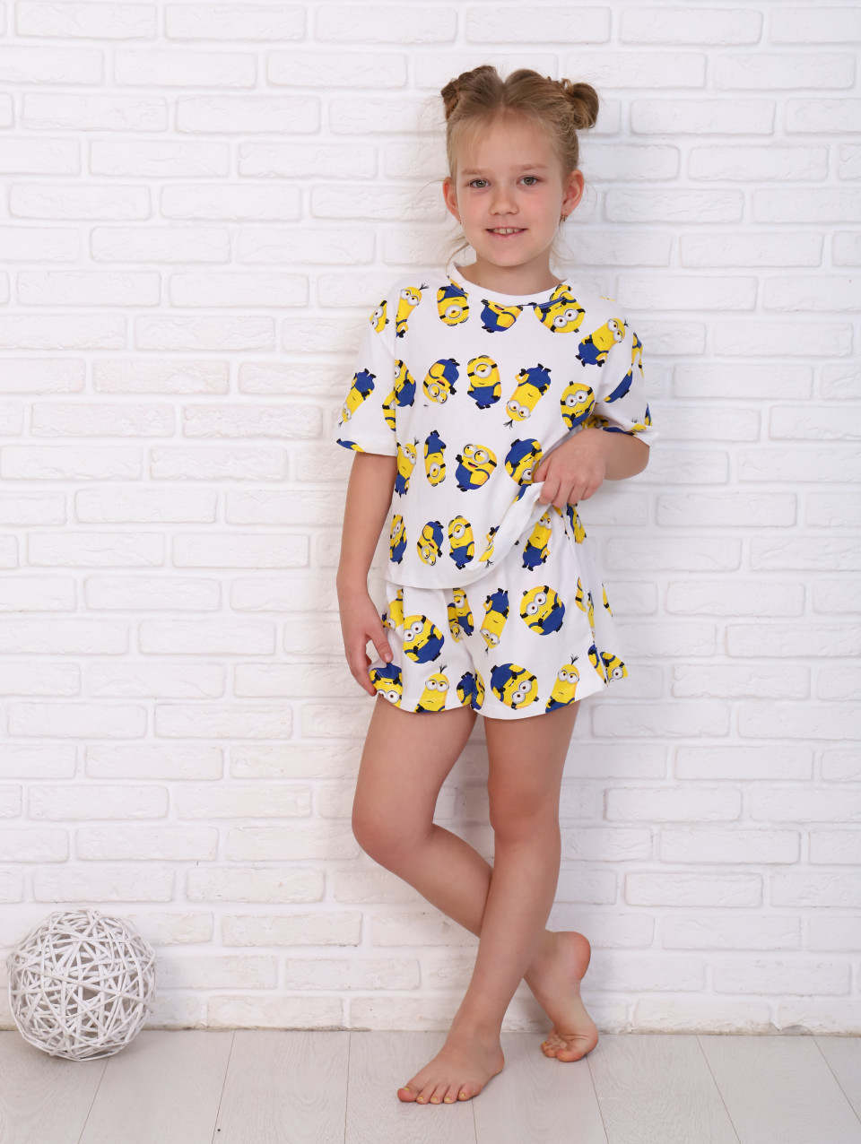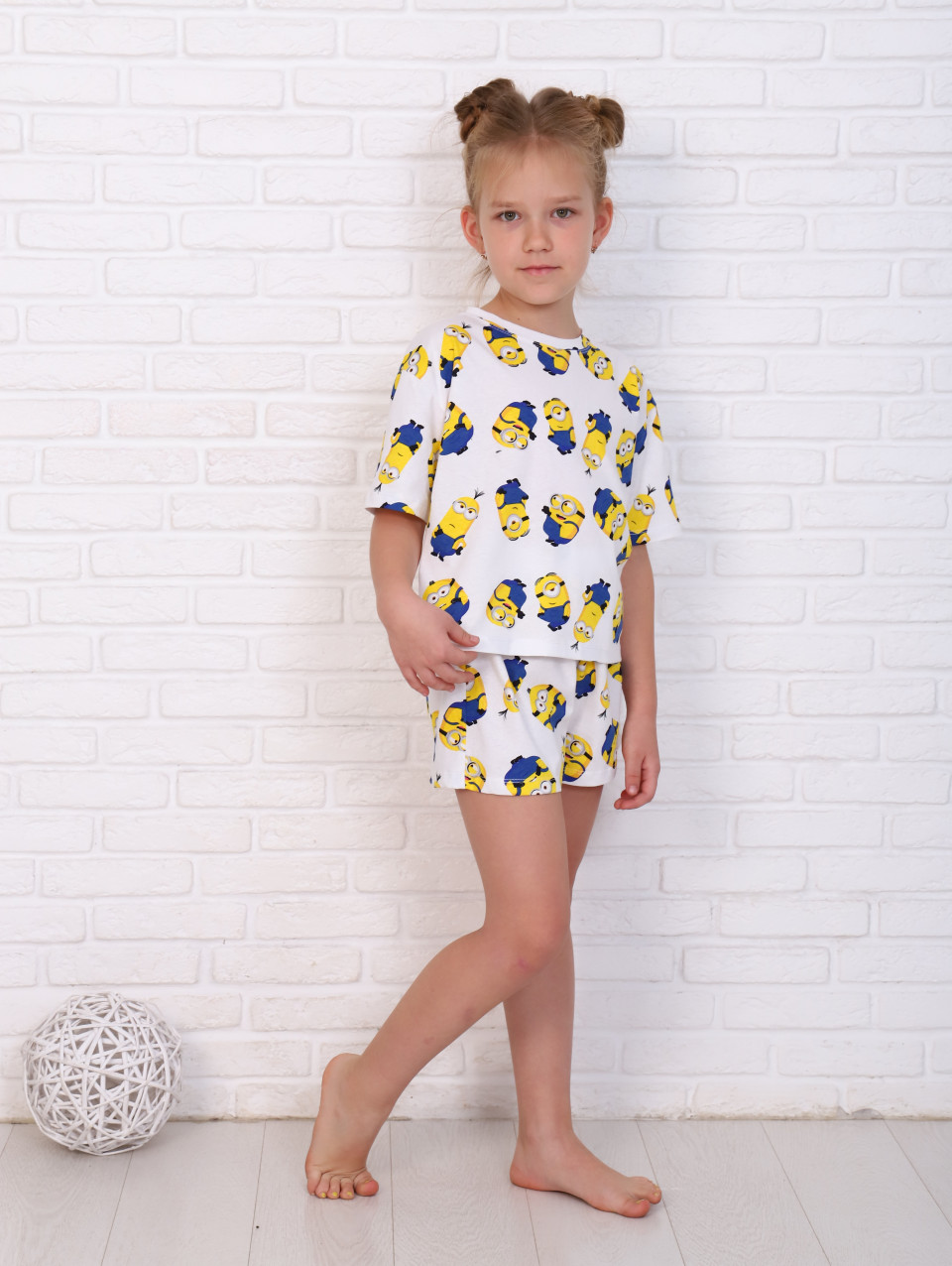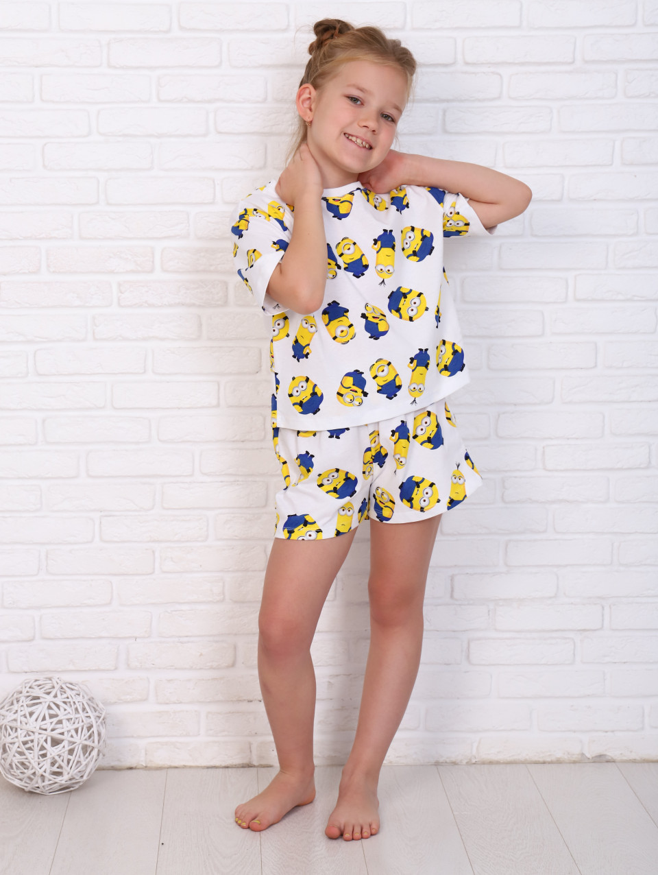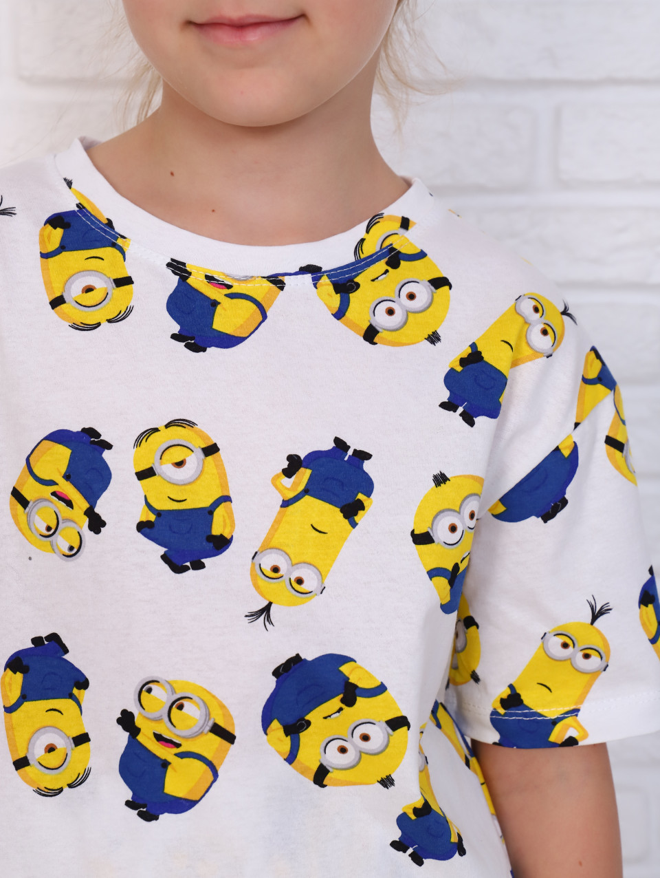 Детский костюм оверсайз с любимыми миньонами. Футболка со спущенным рукавом, свободного покроя. Широкие подростковые шорты на резинке. Домашний комплект для девочки подойдет в качестве пижамы.