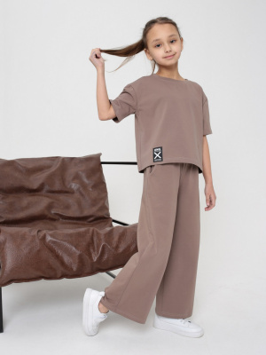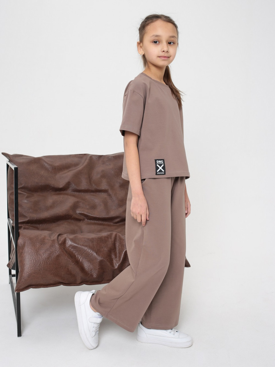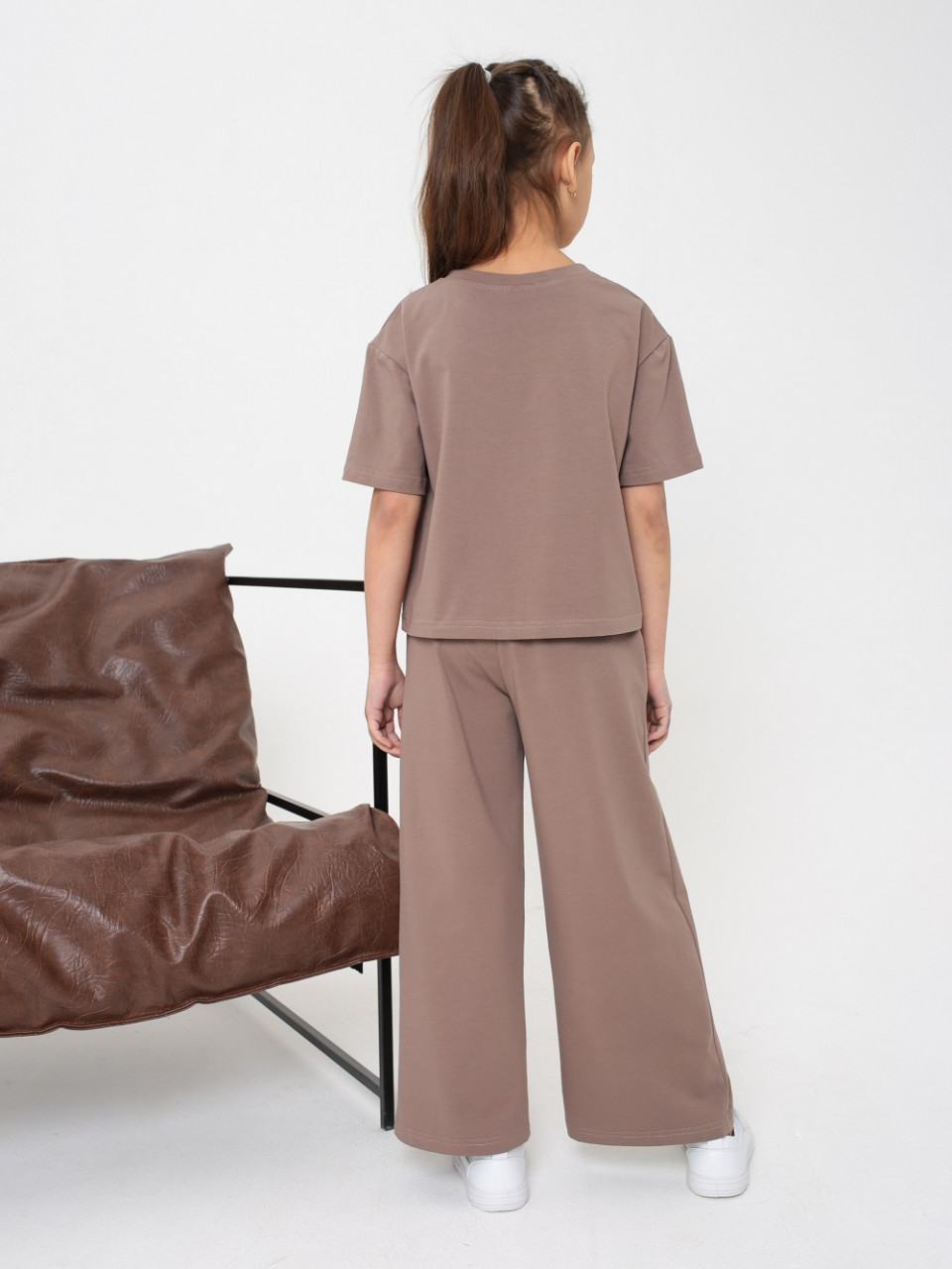 Спортивный костюм для девочки и для девочек подростков с брюками. Комплект представляет собой брюки и футболку. Брюки палаццо свободные и широкие, клеш, с карманами. Штаны на мягкой широкой эластичной резинке на поясе, которая не передавливает кожу, подстраивается под ваше положение тела и движения и обеспечивает комфорт на целый день. Футболка прямого кроя с коротким рукавом и округлым вырезом горловины. Костюм детский изготовлен из нежного трикотажного полотна высокого качества из натурального гипоаллергенного 95% хлопка, хб, и 5% лайкра.