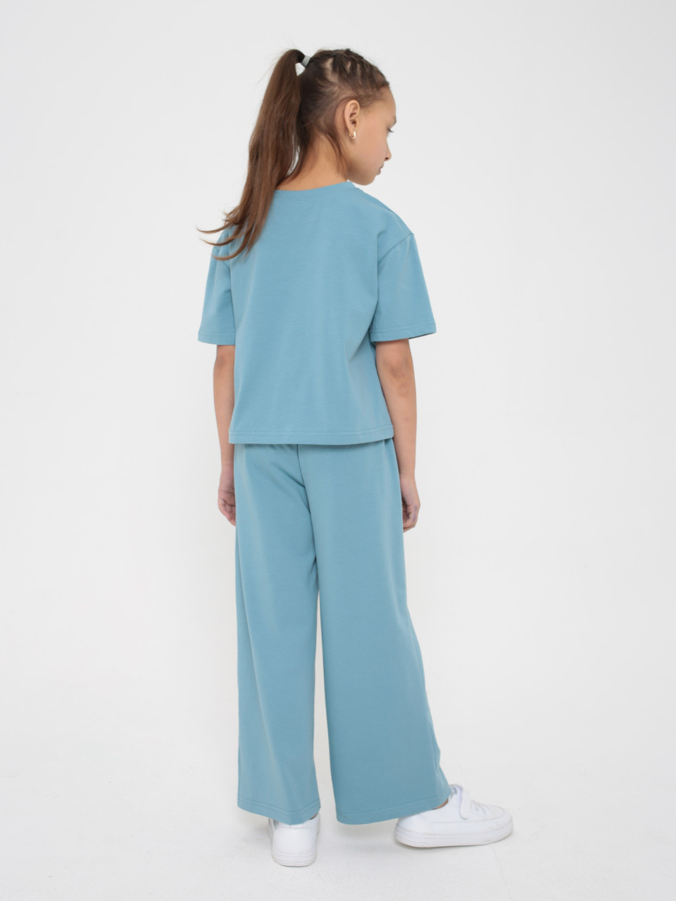 Спортивный костюм для девочки и для девочек подростков с брюками. Комплект представляет собой брюки и футболку. Брюки палаццо свободные и широкие, клеш, с карманами. Штаны на мягкой широкой эластичной резинке на поясе, которая не передавливает кожу, подстраивается под ваше положение тела и движения и обеспечивает комфорт на целый день. Футболка прямого кроя с коротким рукавом и округлым вырезом горловины. Костюм детский изготовлен из нежного трикотажного полотна высокого качества из натурального гипоаллергенного 95% хлопка, хб, и 5% лайкра.