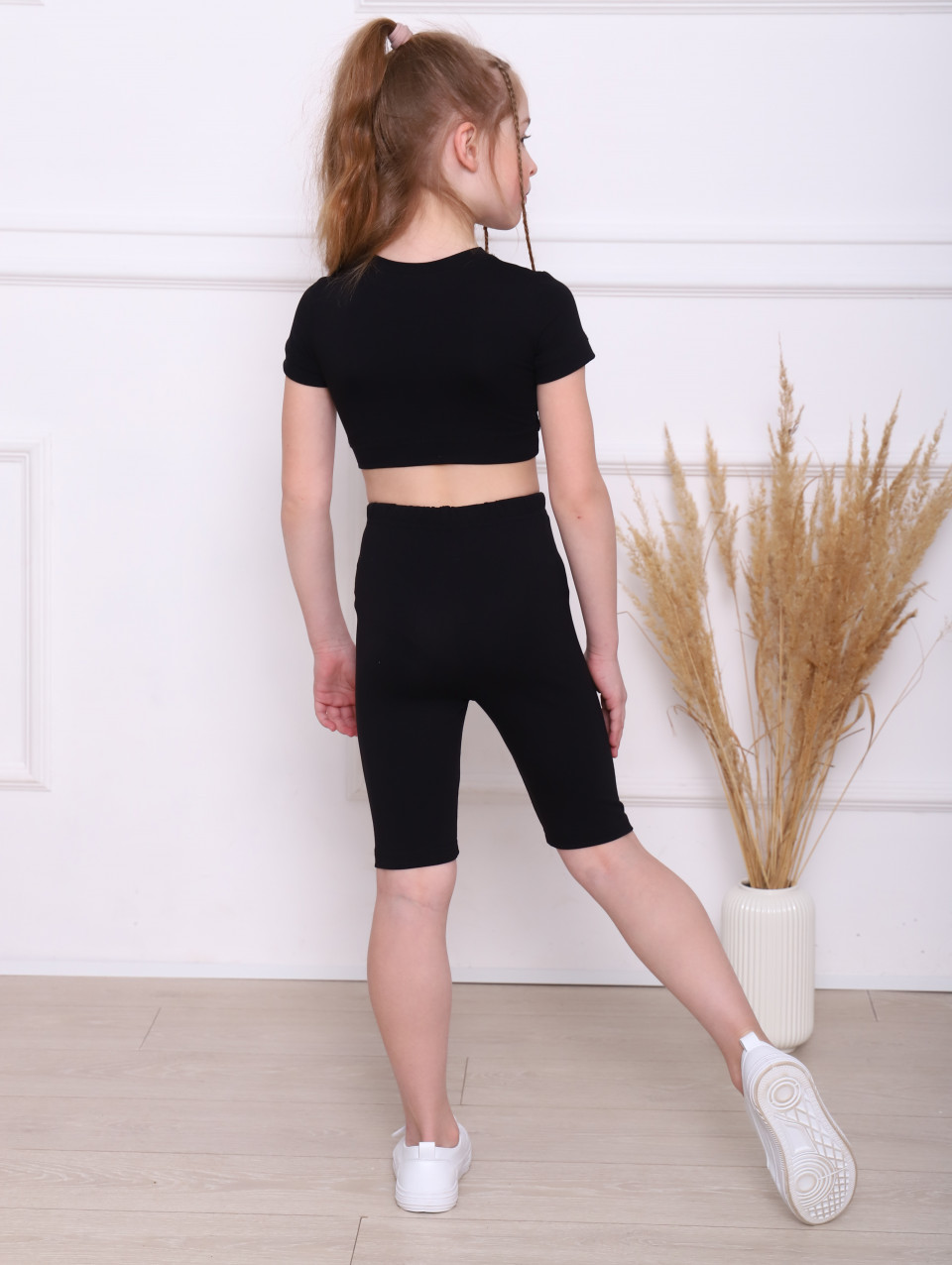 Спортивный костюм для девочки и для девочек подростков. Комплект представляет собой топ и леггинсы. Шорты облегающие на мягкой эластичной резинке на поясе, которая не передавливает кожу, подстраивается под положение тела и движения, обеспечивая комфорт на целый день. Футболка укороченная с округлым вырезом горловины. Костюм детский изготовлен из нежного трикотажного полотна высокого качества из натурального гипоаллергенного 95% хлопка, хб, и 5% лайкры для сохранения формы изделия после стирки и во время носки. Детский спортивный костюм можно использовать как одежду для дома, как домашний костюм, пижама, одежда на улицу, костюм на каждый день. Части комплекта можно комбинировать, например, футболку с шортами или юбкой, велосипедки с джемпером или толстовкой и т.д. Идеальный подарок ребенку, детям: для девочки, внучки, дочери, для сестры т.д. Базовая детская вещь незаменимая для детского гардероба.