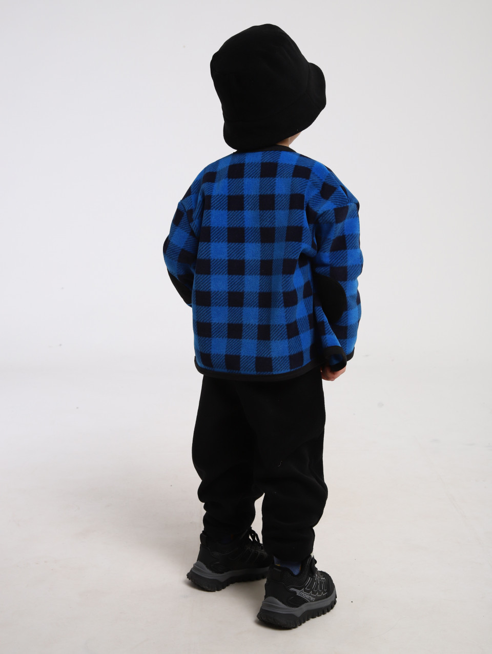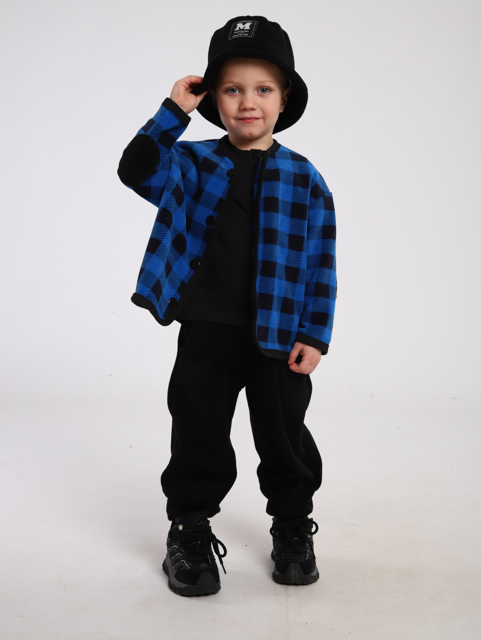 Костюм состоит из теплой рубашки на пуговицах и брюк с эластичным поясом, что обеспечивает свободу движений и удобство. На рукавах стильные "заплатки"
