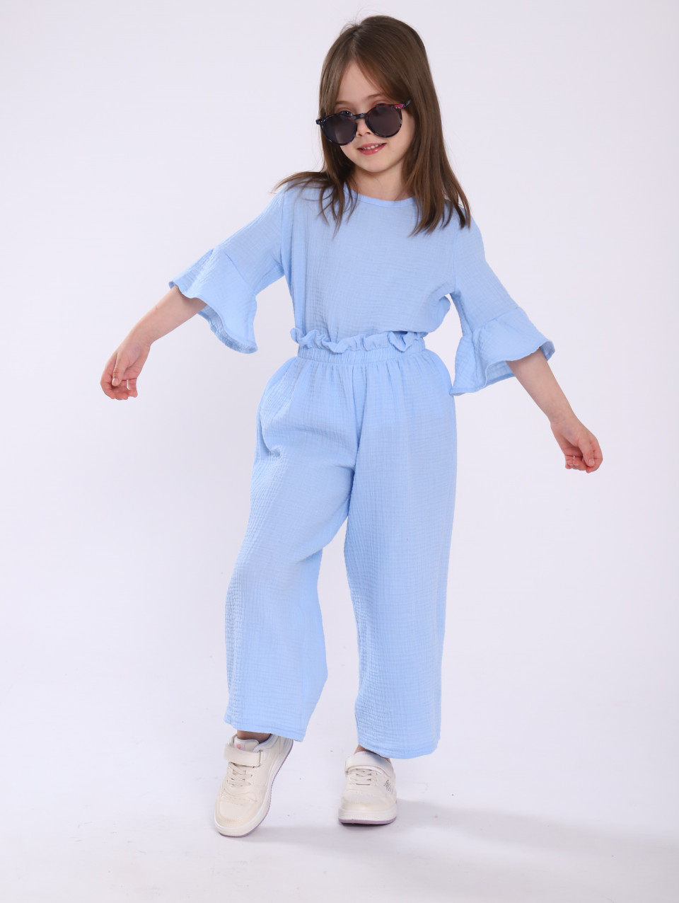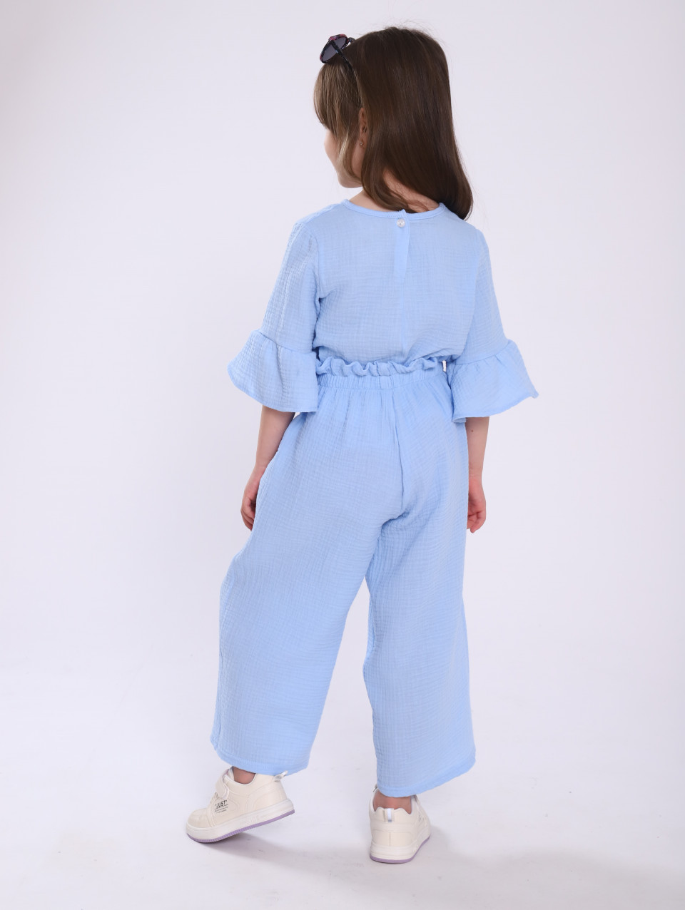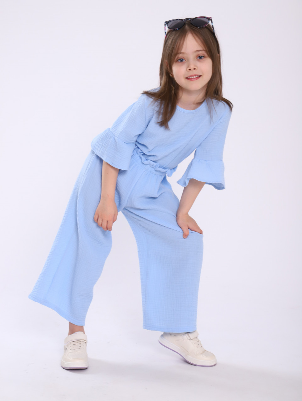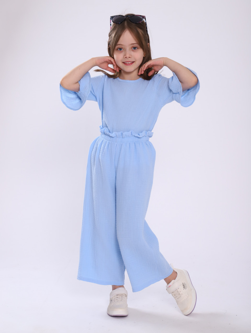 Летний костюм для девочки из муслина. Костюм включает в себя  брюки палаццо и нежную блузку. Это идеальный вариант для летнего сезона. В таком костюме будет комфортно даже в самые жаркие дни. Муслин - это 100% хлопок, считается наилучшей среди тканей для детской одежды. Комплекты для детей из муслина могут использоваться в любое время года, ткань прекрасно впитывает влагу и не ощущается на коже. Кроме того, данная одежда износостойкая, приятная к телу, комфортная и удобная.