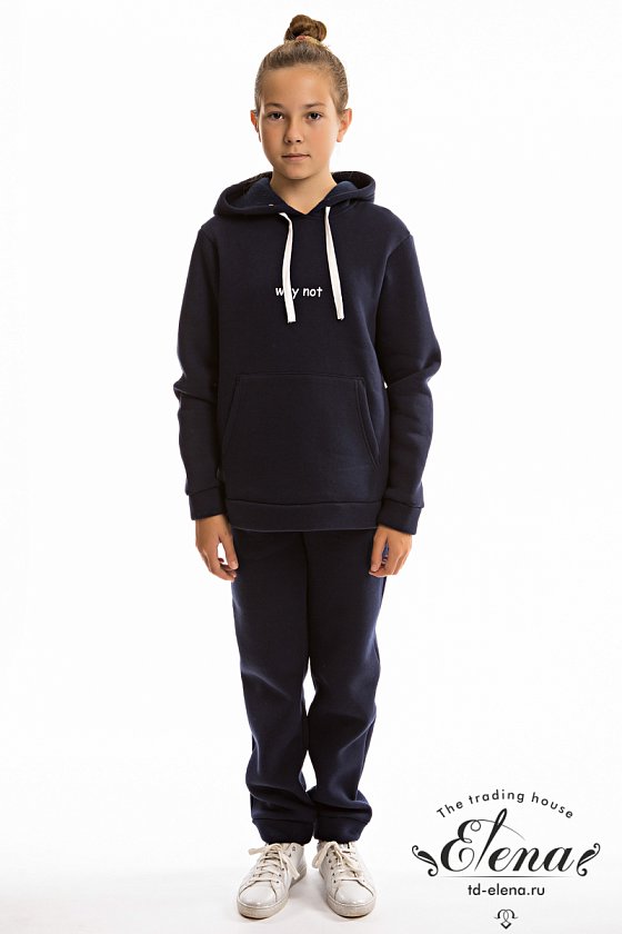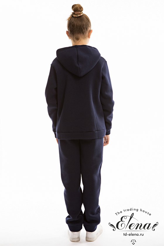 Костюм выполнен из футера с начёсом (трёхнитка), состоит из толстовки и брюк. Толстовка с капюшоном, карманом-кенгуру и принтом спереди. Пояс толстовки, низ рукавов и низ брюк оформлены манжетами из основного полотна. Пояс брюк на резине и шнуре.