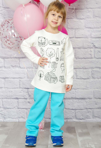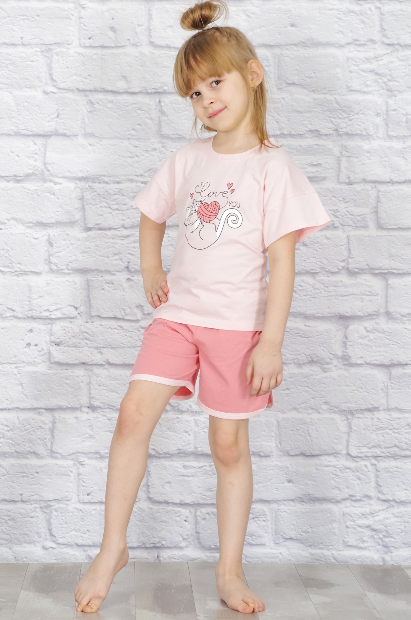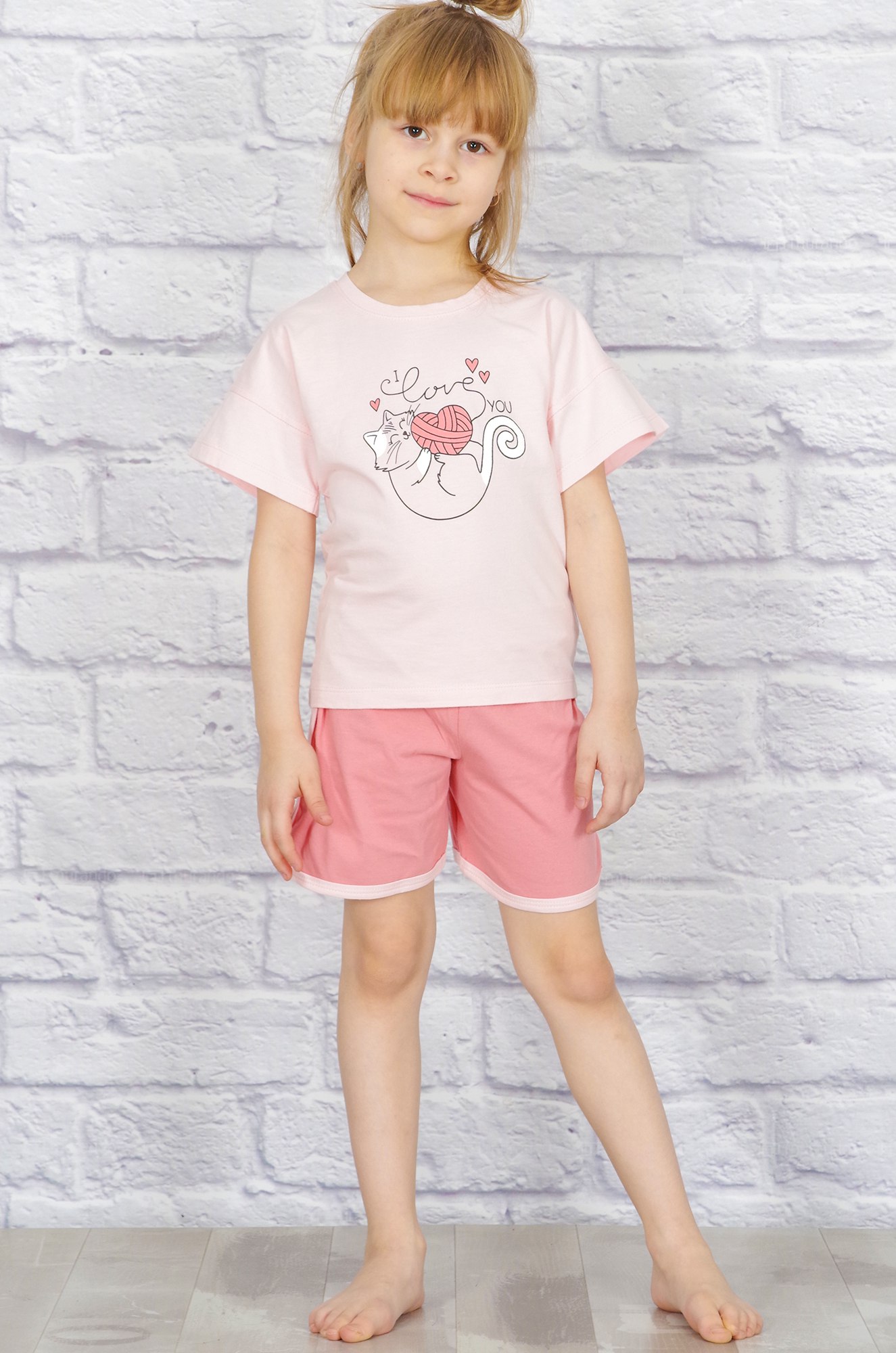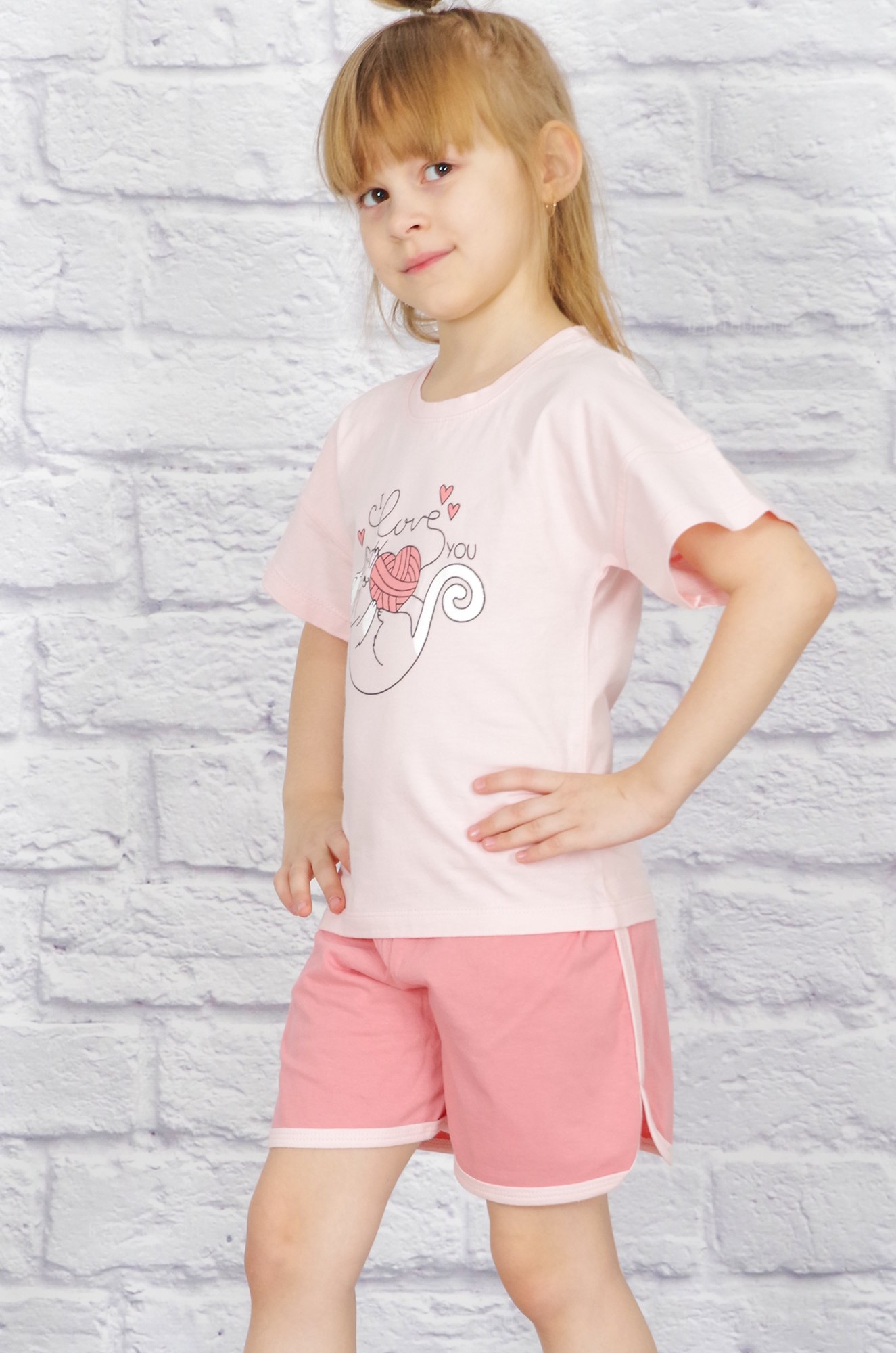 Удобный хлопковый костюм для девочек -  отличный вариант как для домашних игр, так и для летних прогулок. Футболка прямого кроя, на полочке печатный рисунок. Короткие шортики "в спортивном стиле" с оригинальными закруглёными вырезами по бокам, пояс на широкой резинке. Ткань кулирка - мягкая, приятная к телу и комфортная в любой сезон.