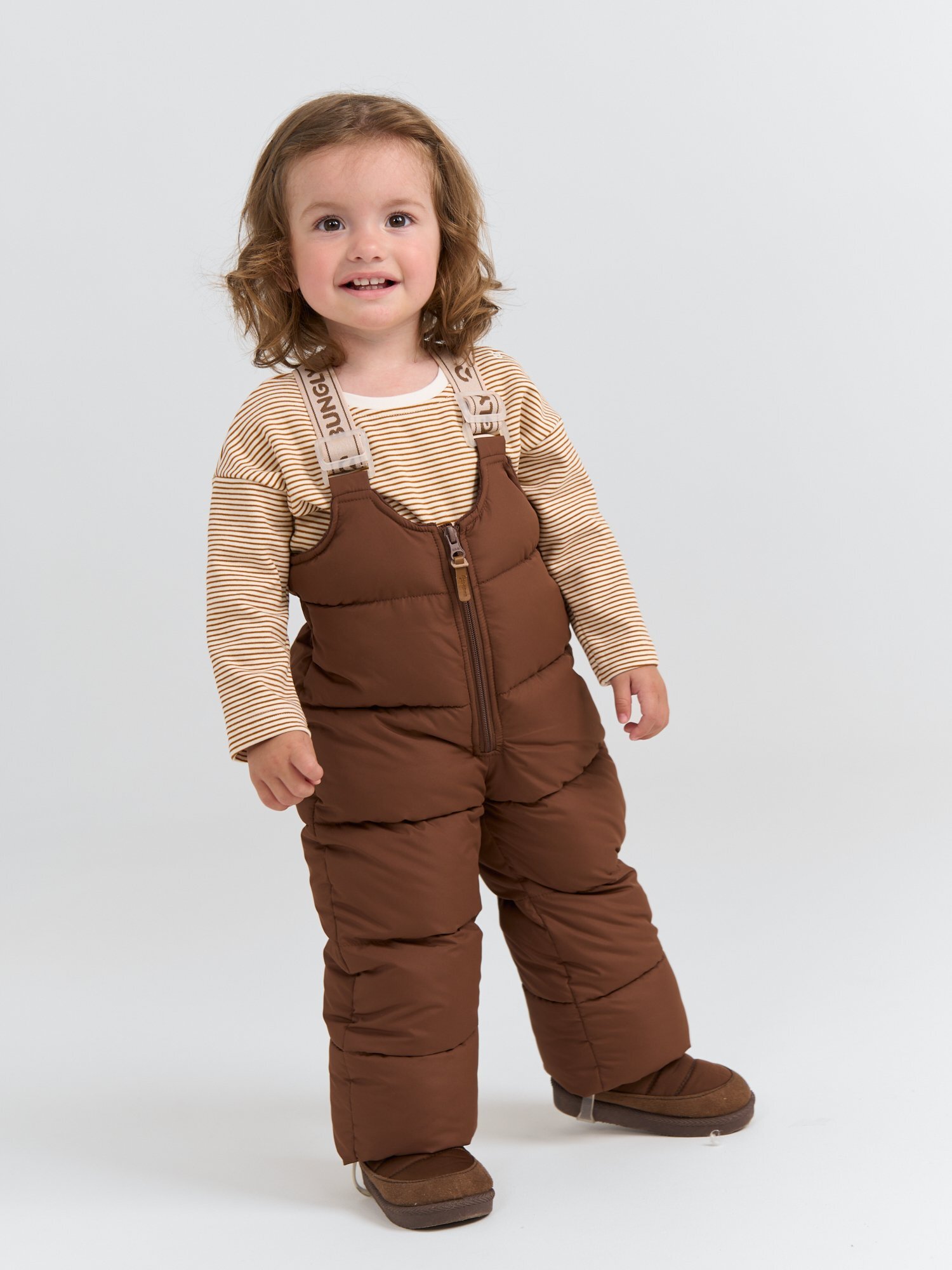 Стеганый полукомбинезон с центральной молнией. Малыш может надевать и снимать изделие даже самостоятельно.