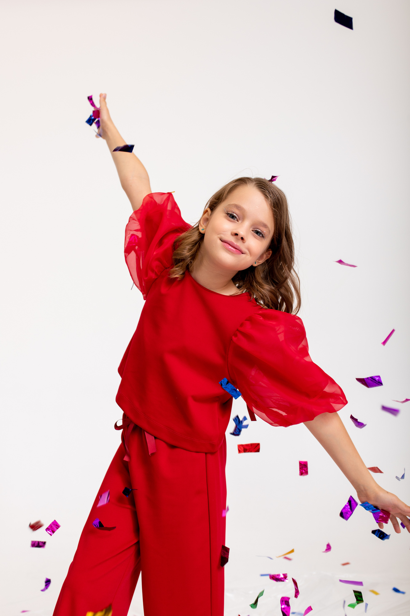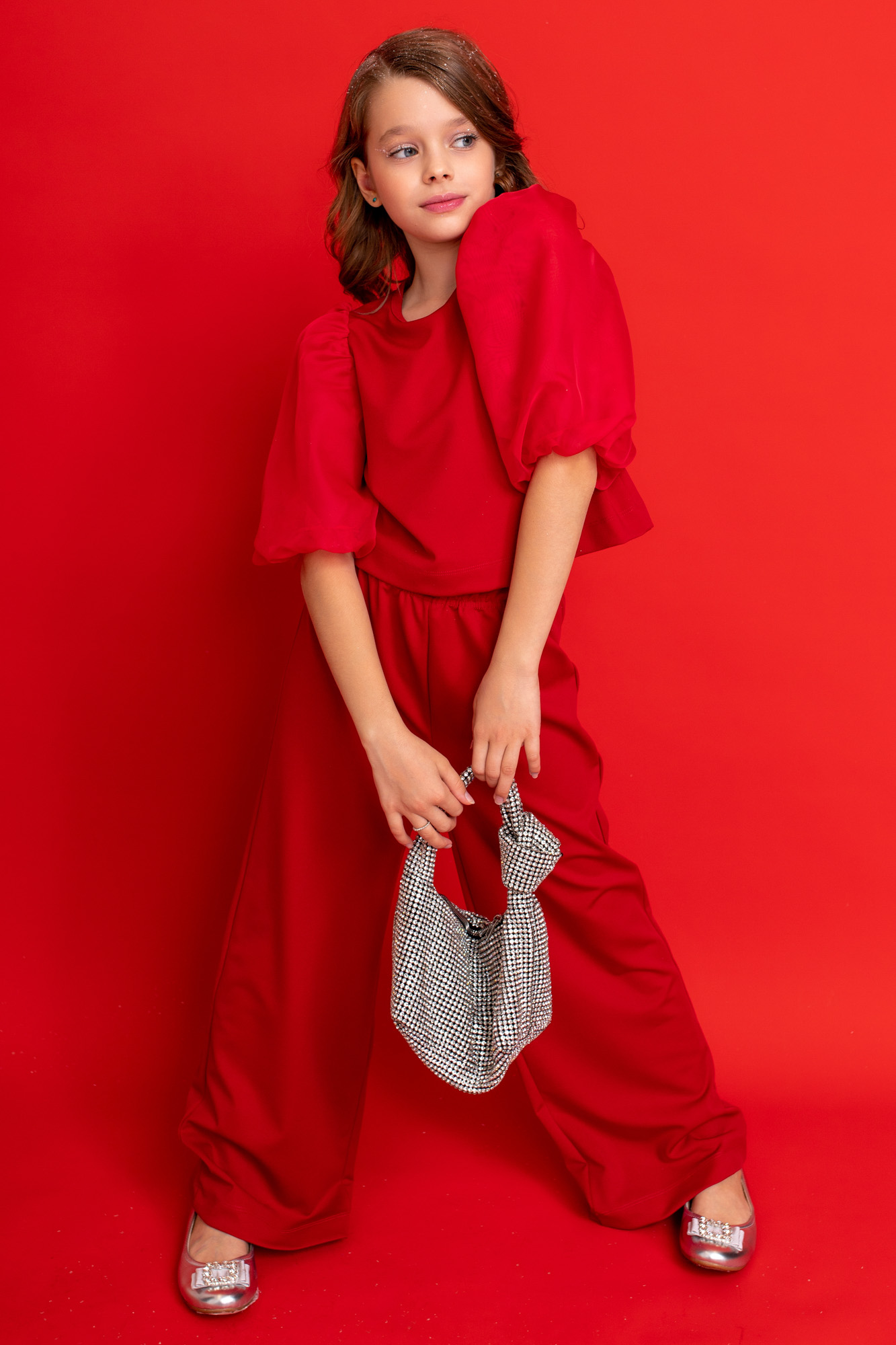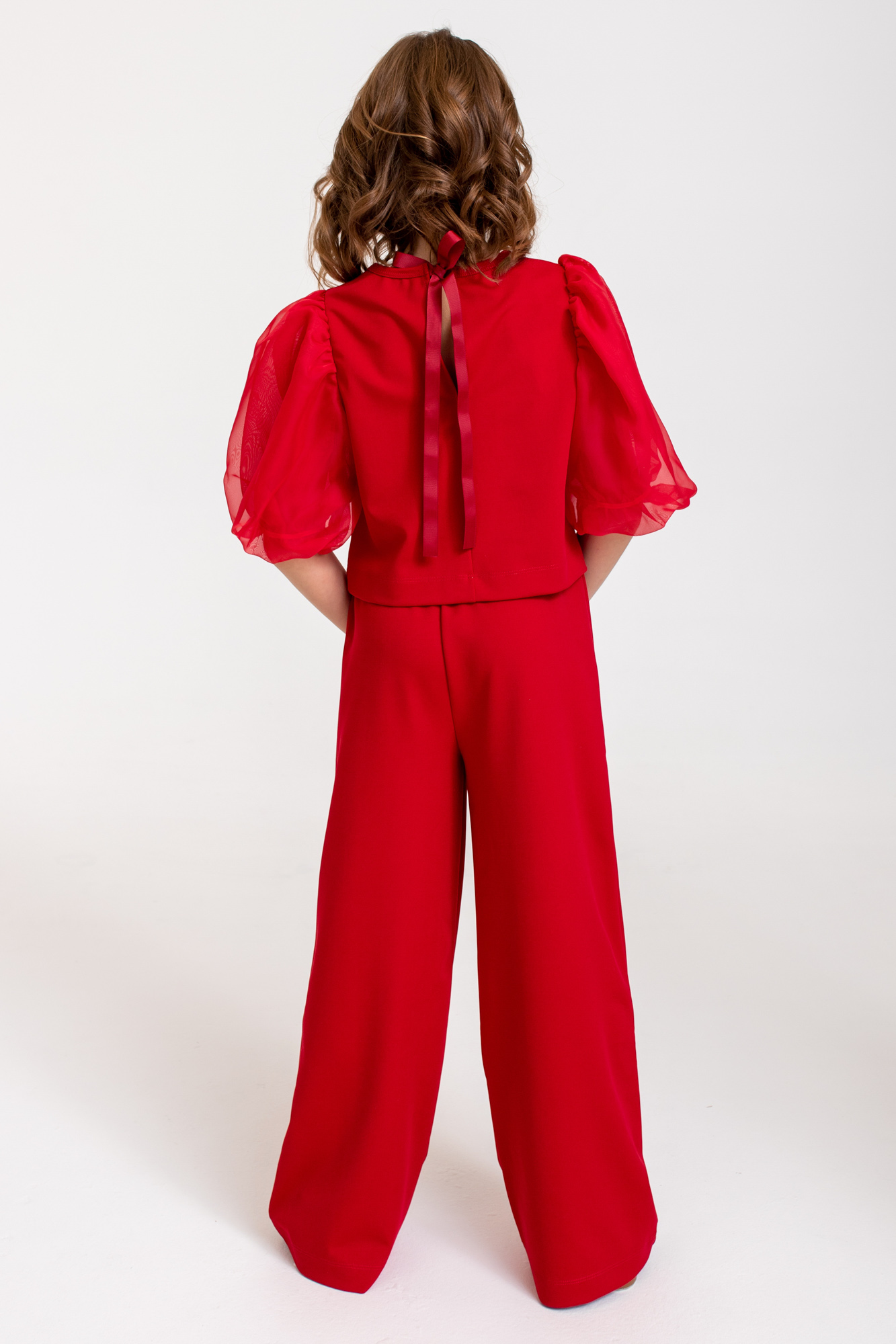 Состоит из топа с воздушными капроновыми рукавами и брюк-палаццо.
