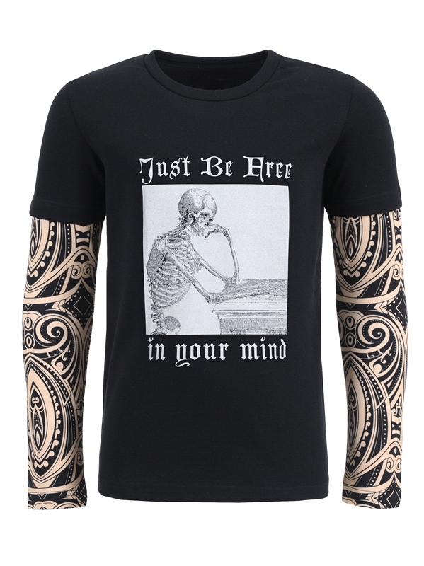 кулир с лайкрой / хлопок 92% + лайкра 8% - / черный+тату ацтеков / Задумчивый скелет