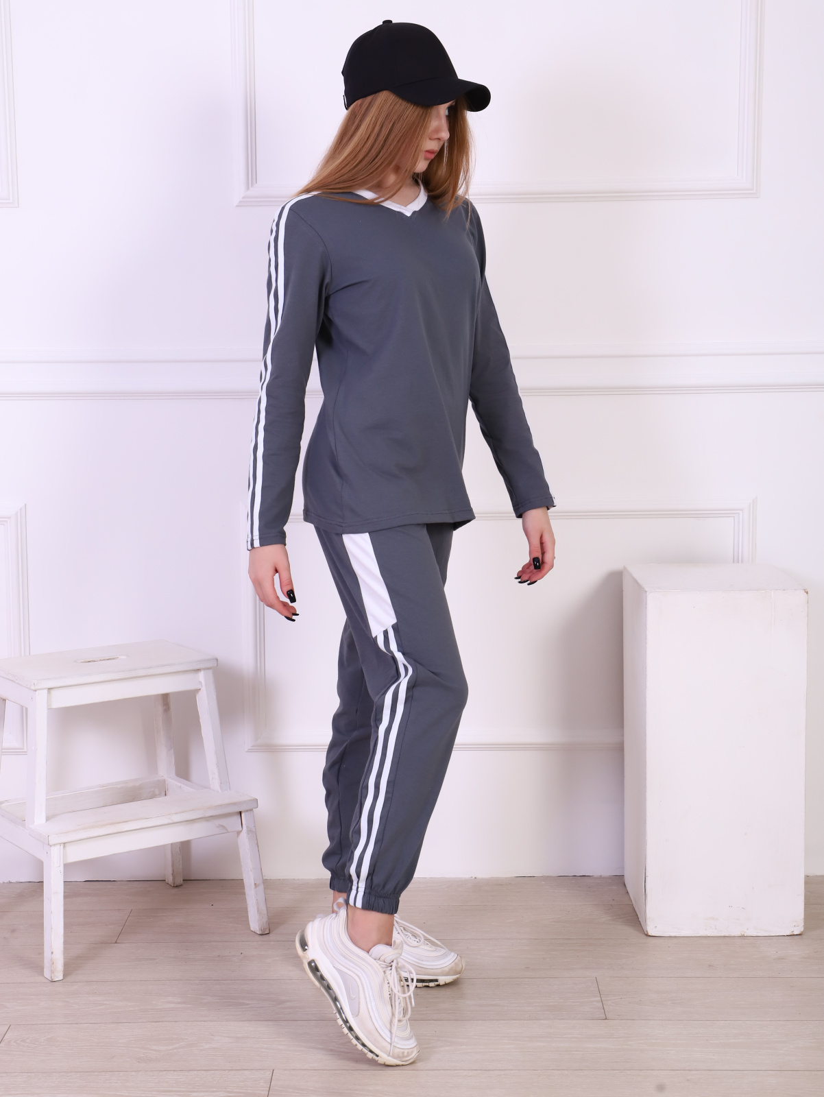 Кофта прямого силуэта, вырез горловины с белой каймой. Облегченный свитшот с белыми полосками на рукавах.