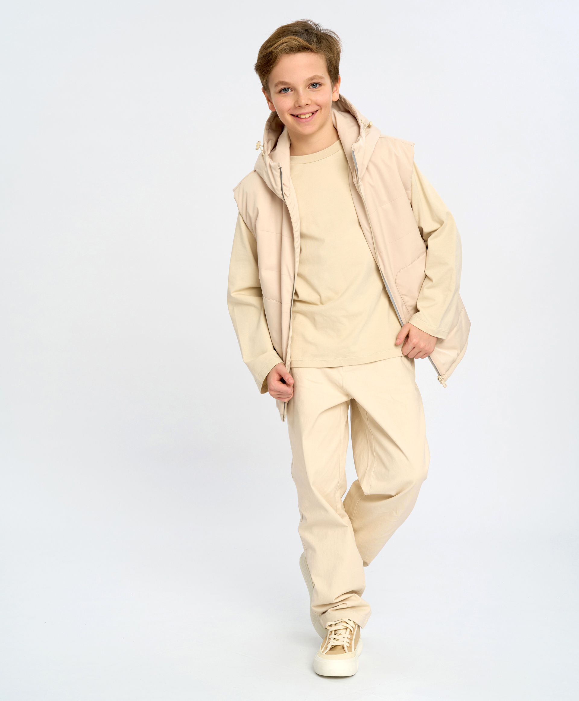 Молочный жилет из плащевки не промокает. Утеплитель синтепон 100 г/м2, гладкая текстильная подкладка, глубокий капюшон с утяжкой и высоким воротом делают модель идеальной для весны и осени. В утепленной жилетке будет комфортно даже в +10°С. В ней можно отправиться на прогулку, шопинг, в путешествие или на учебу. В больших карманах ребенок может греть руки или хранить мелочи. Модель застегивается на прорезиненную молнию с защитой от защемления. Крой прямой - не сковывает. Для безопасности имеются светоотражающие элементы и адресник, а для практичности – рибовый материал по нижнему краю. Изделие создано в нейтральном оттенке песчаный берег. Жилет на подростка универсальный – подойдет мальчикам и девочкам.