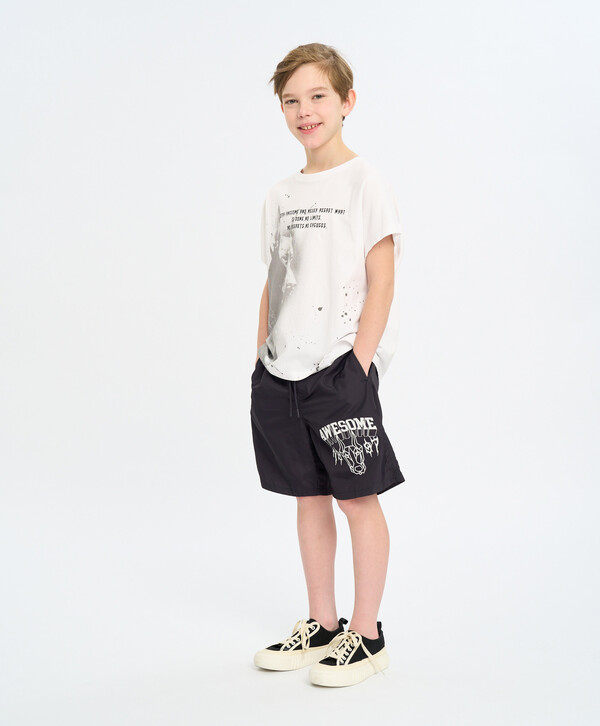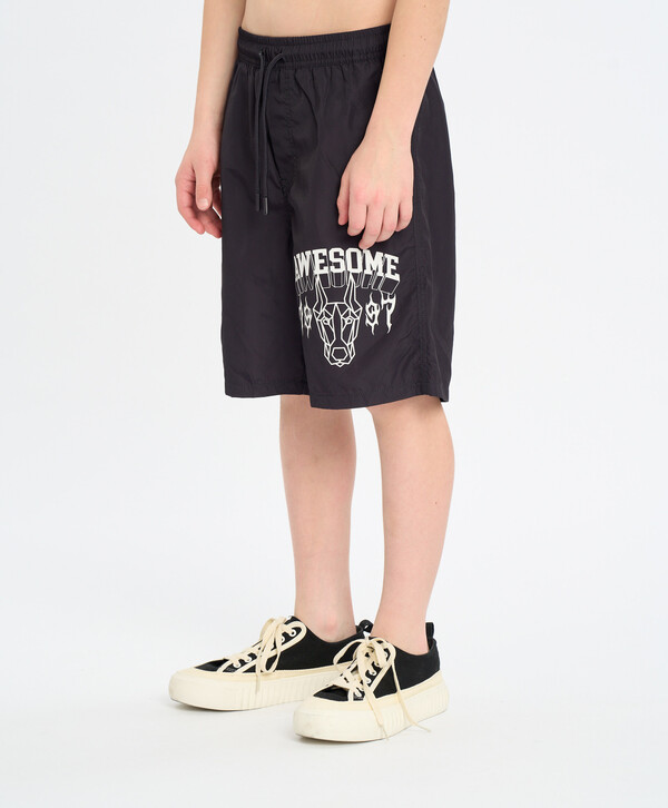 Шорты для купания для мальчика выполнены из легкого, почти невесомого материала, который быстро сохнет и сохраняет цвет даже после контакта с агрессивной соленой водой. Гидрошорты сделаны со вшитыми сетчатыми трусиками и карманами для максимального комфорта. Свободный крой без прилегания будто создан для активных детей. Идеальную посадку обеспечивает пояс на резинке с завязками для утяжки. Есть имитация гульфика. Модель подойдет для бассейна и пляжа. Детские шорты для плавания легко сочетать с пляжной одеждой любого цвета благодаря универсальному черному однотону. Трендовости добавляет контрастный принт с одной стороны.