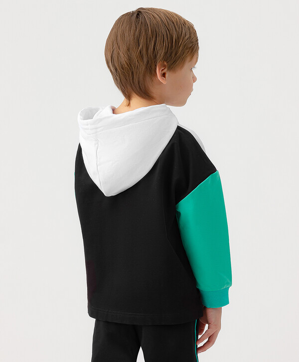 Разноцветное оверсайз худи для мальчика с крупным текстовым принтом определенно порадует ребенка стильным дизайном. Натуральная хлопковая ткань с небольшим добавлением эластана подарит приятные ощущения при соприкосновении с кожей, обеспечивая оптимальный воздухообмен. Прямой крой толстовки из футера в сочетании со спущенной линией плеча способствует свободной посадке для легкости в движениях. Удобный капюшон можно затянуть при помощи функциональных завязок. Манжеты на рукавах выполнены из эластичной рибовой ткани, поэтому будут мягко прилегать к телу. Сочетание черного, белого и бирюзового цветов наполнит яркими красками любой образ. Состоящий из двух частей текстовый принт INFINITY, неглубокие боковые разрезы и брендированная нашивка с монограммой на шве создают эффектную комбинацию. Детская кофта с капюшоном в околоспортивном стиле оптимально сочетается с джоггерами, шортами и джинсами из коллекций Button Blue. Модель длиной до бедра представлена в размерах от 98 до 128.