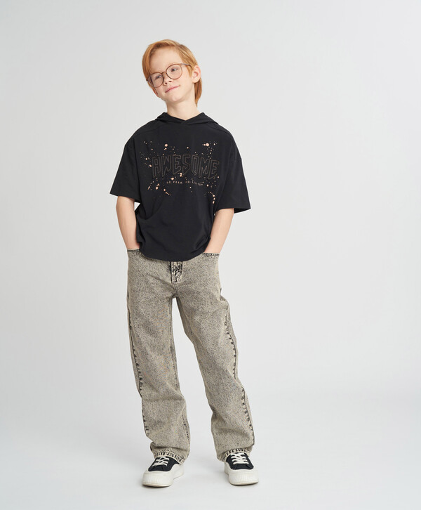 Серые джинсы универсальные – подходят мальчикам и девочкам. Модель из хлопка плотная, но дышащая, застегивается на молнию и крючок, имитирующий пуговицу. За идеальную посадку отвечает скрытая тесьма на пуговке, которой можно отрегулировать объем. Джинсовые брюки regular fit удобные, облегают бедра, но не обтягивают, прямые по длине, есть шлевки для ремня и карманы. Градус стиля повышает эффект варенки. Джинсы для мальчика и девочки отлично впишутся в повседневный гардероб благодаря нейтральному серому цвету, но также подойдут для прогулок, учебы и путешествий.