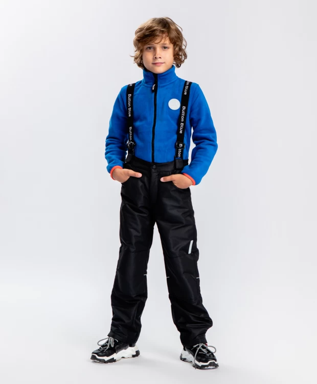 100% полиэстер Черные брюки из серии ACTIVE с флисовой подкладкой без утеплителя для мальчика. Регулируемые подтяжки помогут подобрать оптимальную посадку. Подтяжки можно полностью снять - они крепятся к брюкам при помощи удобных липучек. Подкладка модели выполнена из мягкого и согревающего флиса. Прямой крой брюк обеспечивает свободу в любых движениях. Верх изделия выполнен из мембраны, которая препятствует попаданию влаги и одновременно отводит ее изнутри. Свойства мембранной ткани - водостойкость - 5000 мм, паропроницаемость - 5000 г/м/24. Усиленные вставки во внутренней части брючин снизу защитят ткань от истирания во время интенсивной ходьбы. Манжеты на липучках позволят откорректировать ширину штанин по обуви. По бокам расположены удобные прорезные карманы. Однотонные детские брюки от Баттон Блю застегиваются на молнию и пуговицу-крючок. Брендированные подтяжки являются стильным акцентом в дизайне модели. На левой брючине спереди и сзади на штанинах в районе колен находятся светоотражающие элементы.