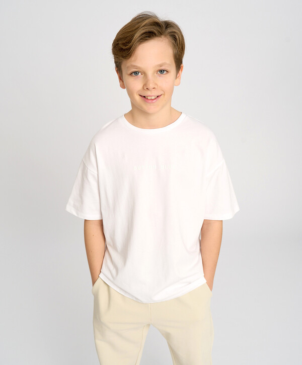 Белая футболка с коротким рукавом подойдет мальчику и девочке. Мягкий трикотаж идеален для нежной детской кожи, а прямой крой без прилегания не сковывает. Футболка на лето нежаркая, при этом плотная и износостойкая, не просвечивается и хорошо пропускает воздух. Круглый вырез обеспечит удобство – изделие удобно снимать и надевать. Однотонную футболку в базовом белом цвет легко сочетать с разными стилями и оттенками. Раббер принт добавляет фактурности, при этом неброский. Модель можно носить круглогодично – самостоятельно в жару и первым слоем в утепленных образах.