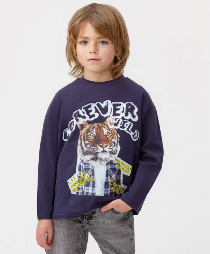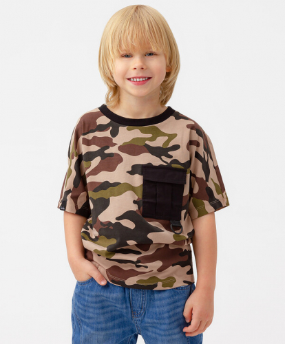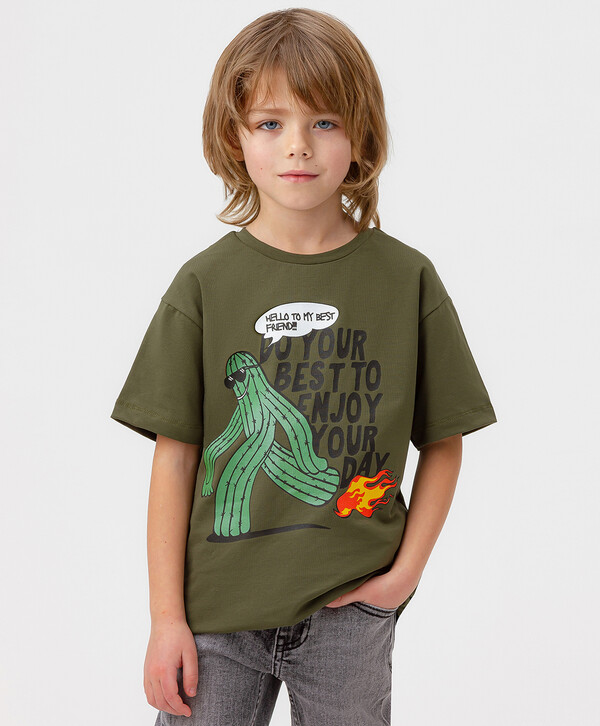 Футболка для мальчика цвета хаки с коротким рукавом и оригинальным принтом придется по вкусу юному моднику. Натуральная хлопковая ткань с добавлением эластана приятна на ощупь, проста в уходе и создает оптимальный воздухообмен, что идеально подходит для весны, лета и ранней осени. Модель длиной до бедра прямого кроя со спущенной линией плеча способствует свободной посадке для легкости при активных движениях. Яркий и оригинальный принт на полочке изделия и стильный логотип нашивка на шве добавляют в образы эффектный акцент. Базовая детская футболка универсального цвета подходит для составления повседневных, праздничных и спортивных образов в сочетании с толстовками, джоггерами, джинсами и брюками из капсульной коллекции Button Blue. Модель в стиле casual с округлой горловиной представлена в размерах от 98 до 128.