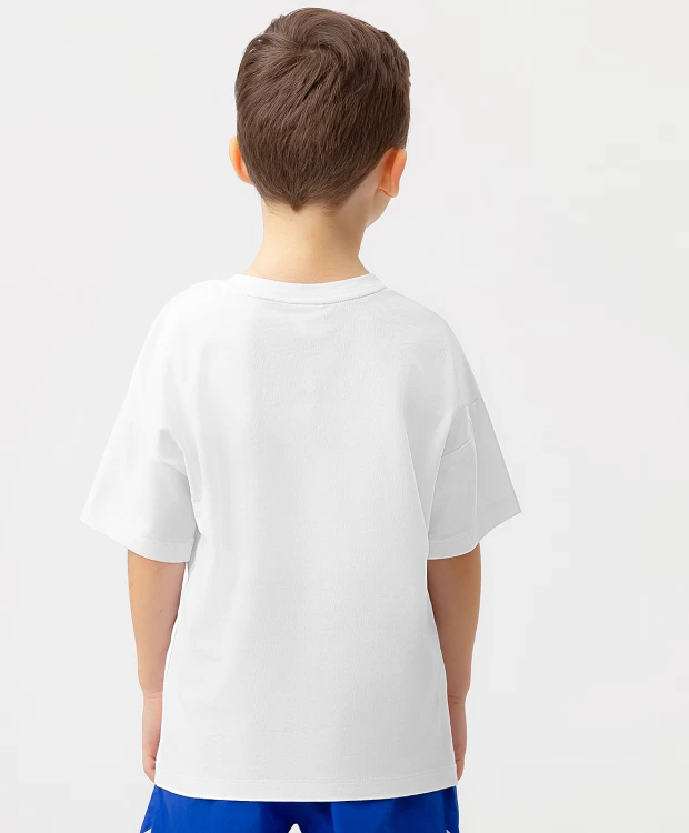 5% эластан Белая футболка для мальчика с коротким рукавом и ярким принтом на полочке из серии ACTIVE. Модель прямого кроя со спущенной линией плеча способствует свободной посадке без облегания. Хлопковая ткань с добавлением эластана приятна на ощупь, проста в уходе и создает оптимальный воздухообмен, позволяя коже дышать. Крупный и яркий принт с добавлением салатового и синего цвета и с оригинальным эффектом движения сделает любые образы запоминающимися и привлекательными. Детская футболка с округлой горловиной идеально сочетается с разнообразием одежды из капсульной коллекции Button Blue. Модель длиной до бедра оптимальна для занятий спортом, отдыха на природе, а также для составления повседневных образов.