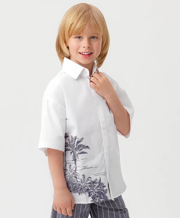 100% хлопок Белая свободная рубашка с коротким рукавом и с лаконичным принтом для мальчика. Модель сшита из поплина - натуральной хлопковой ткани, которая отличается мягкостью и шелковистостью, прочностью и износостойкостью. Качественный материал не растягивается, не деформируется и прекрасно держит форму, и к тому же легко отстирывается в прохладной воде. Прямой крой со спущенной линией плеча способствует свободной посадке без облегания. Модель с классическим воротником застегивается на пуговицы. Эффектный принт с пальмами на полочке поспособствует хорошему отдыху и зарядит ребенка отличным настроением на весь день. Рубашка длиной до середины бедра идеально сочетается с разнообразием одежды из коллекций Button Blue и походит как для повседневных, так и для более праздничных мероприятий в городе, на море или в детском лагере.