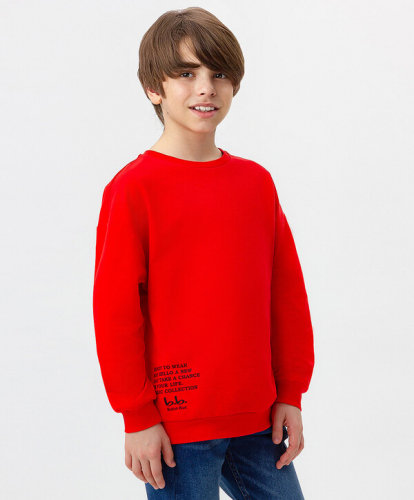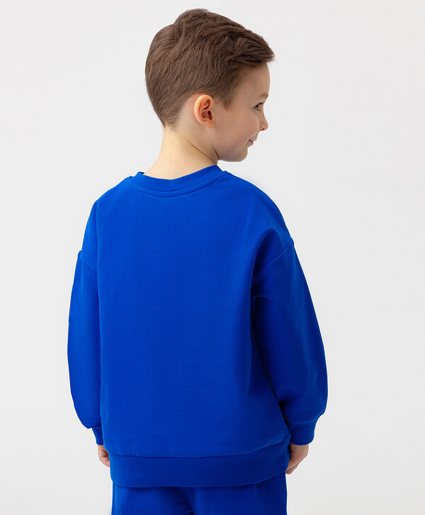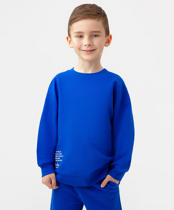 Синий базовый свитшот для мальчика с округлой горловиной и контрастным текстовым принтом обеспечит хорошее настроение и максимальный комфорт в носке. Уютная модель из футера имеет гладкую лицевую сторону и петельчатую изнанку без начеса. Мягкая хлопковая ткань с добавлением эластана приятна на ощупь, проста в уходе и обеспечивает оптимальную терморегуляцию. Прямой крой изделия способствует свободной и модной посадке oversize. Низ изделия, горловина и манжеты выполнены из эластичной рибовой ткани, поэтому мягко прилегают к телу. Лаконичный белый текстовый принт на полочке снизу является стильным дополнением к общему дизайну модели. Яркий детский свитшот оптимально сочетается с джоггерами, джинсами, брюками и шортами из коллекций Button Blue. Модель длиной до бедра представлена в широком размерном диапазоне от 98 до 158.