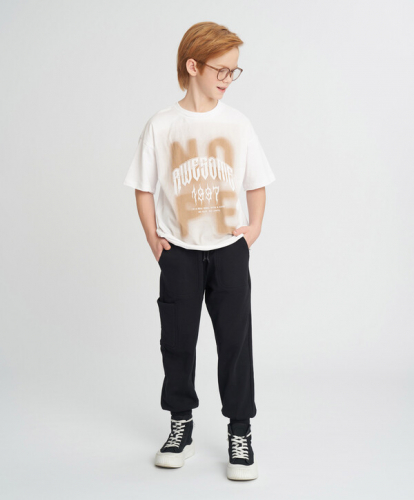 Белая футболка для мальчика сделана из смесового материала джерси с хлопком в основе. Модель отличается гладкостью, она дышащая и приятная тактильно. Оверсайз футболка для подростка с коротким рукавом выполнена со спущенной линией плеча и сидит свободно – идеально для активного ребенка. Модель в классическом белом цвете легко сочетать и внедрять в повседневный, спортивный и домашний гардероб. Трендовости трикотажной футболке добавляет шрифтовой потертый принт, бежевые цветовые акценты и необработанные края.