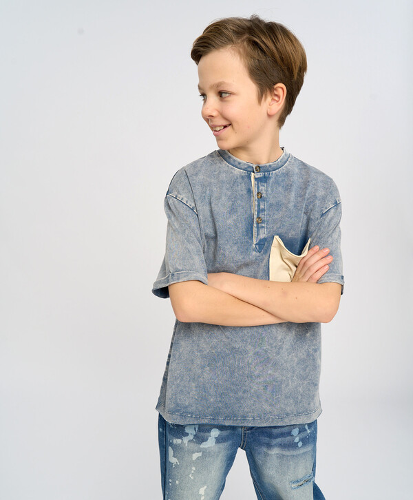 Прямая футболка с коротким рукавом для мальчика сделана из смесового материала джерси, поэтому мягкая, дышащая и приятная к телу. Спущенная линия плеча и прямой крой будто созданы для активных мальчишек. Модель хенли выполнена с рукавами оптимальной длины – до локтя, и с подворотами. Спереди имеются три пуговки. Свободную футболку для мальчика легко внедрять в повседневный, спортивный и домашний гардероб. Модель смотрится интересно за счет эффекта стирки или варки и необработанного края ворота. Детская футболка сделана в синем цвете с контрастным бежевым накладным карманом на груди.