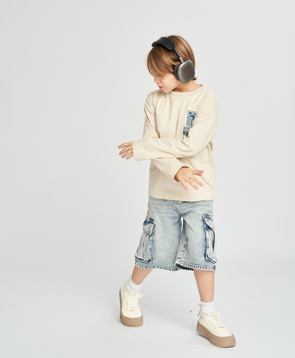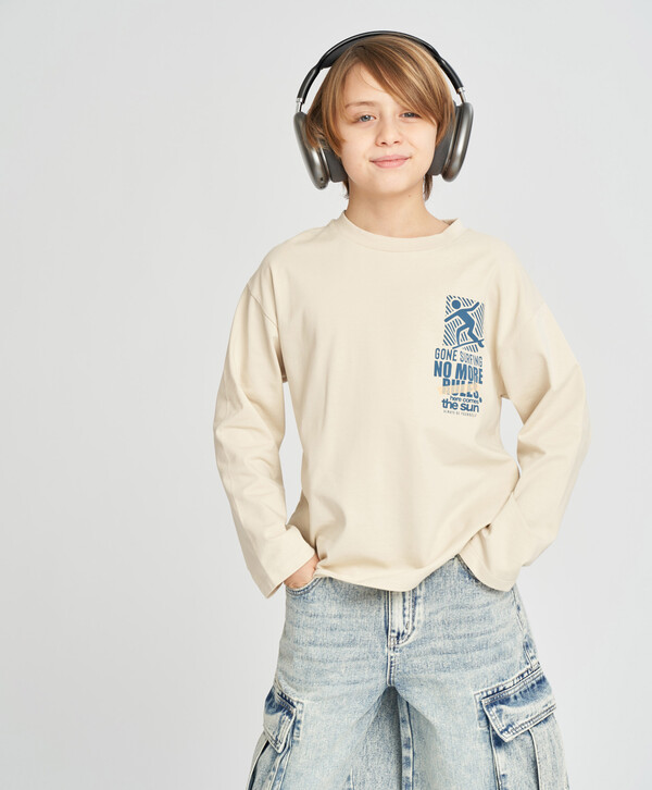 Бежевый лонгслив для мальчика выполнен из смесового материала джерси с хлопком в основе. Он дышащий, мягкий, гладкий и простой в уходе. Футболка с длинным рукавом сделана прямого кроя, с классическим круглым вырезом и со спущенной линией плеча для максимального комфорта. Лонгслив для подростка подойдет под все благодаря спокойному бежевому цвету оттенка песчаный берег. Для настроения имеется небольшой контрастный принт на груди и большой шрифтовой принт на спине.