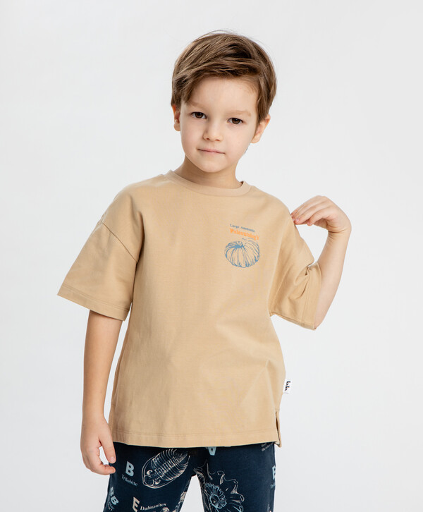 Базовая футболка оверсайз. Бежевый цвет делает футболку универсальной и подходящей для любого случая - хоть на прогулку, хоть на спорт. Благодаря высококачественным материалам (95% хлопок, 5% эластан) ваш ребенок будет чувствовать себя комфортно в любое время года. Футболку можно использовать как самостоятельный предмет гардероба или вторым слоем под свитшот или худи. Мини-принт спереди добавляет оригинальности. За счёт универсального оттенка и силуэта оверсайз футболка подойдет к любому стилю и будет легко сочетаться с другими элементами гардероба мальчиков и девочек.