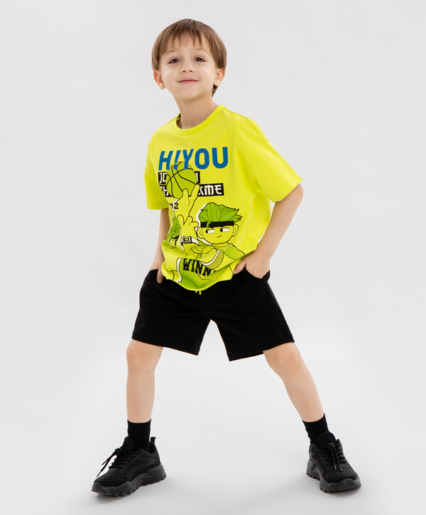 Чёрные шорты с принтом. Шорты с поясом на резинке - идеальный выбор для мальчиков, которые ценят своё время и мечтают составлять стильные летние образы за считанные минуты.  Они выполнены из хлопка и полиэстера, за счёт чего приятные к телу, хорошо сохраняют форму и цвет после стирок. Они комфортные и не требуют особого ухода. На шортах есть карманы, позволяющие хранить необходимые мелочи. А принт в виде ярких букв и контрастные завязки делают их интереснее. Пояс на резинке обеспечивает идеальную посадку и комфорт при движении. Благодаря чёрному цвету шорты легко комбинировать с любыми футболками, рубашками и джинсовками.