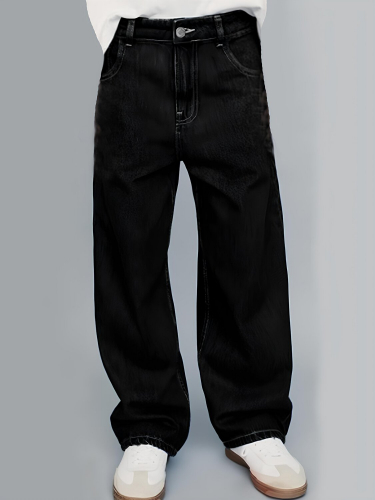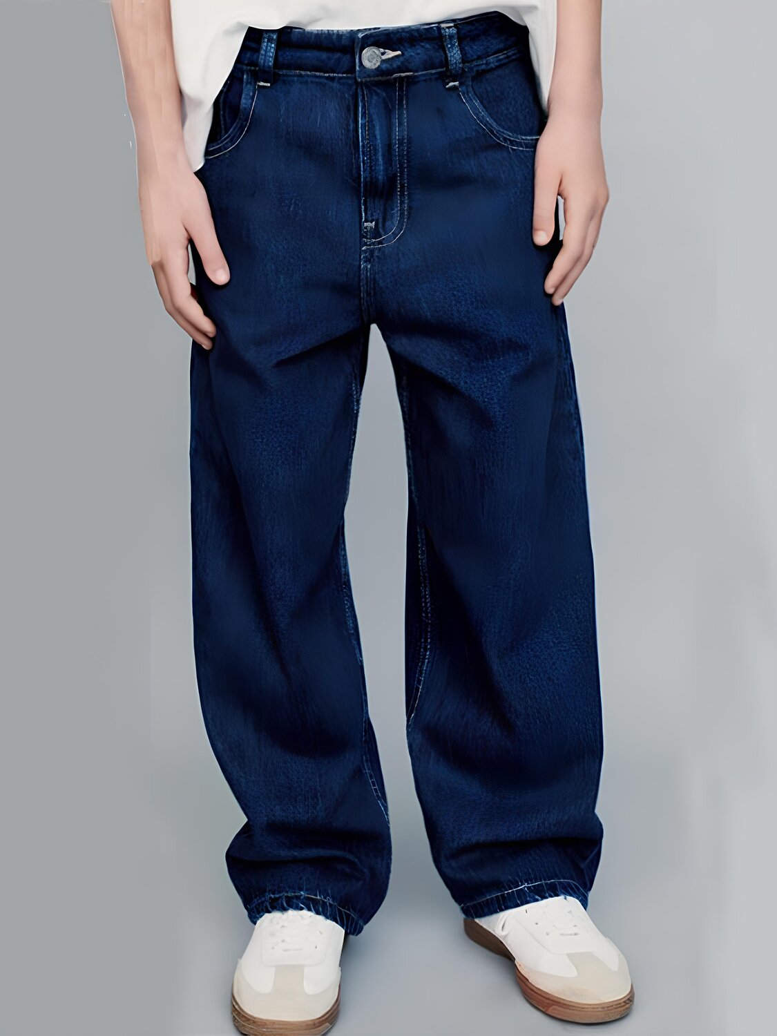 Базовые прямые джинсы со средней посадкой. Деним из натурального 100% хлопка. Классическая модель подойдет как девочкам, так и мальчикам. Брюки будут гармонично смотреться с объемным верхом кроя оверсайз.Два прорезных кармана спереди, кармашек для мелочи, два накладных кармана сзади. Застежка на молнию и пуговицу, пояс с резинкой для регулировки обьема, шлевки для ремня.