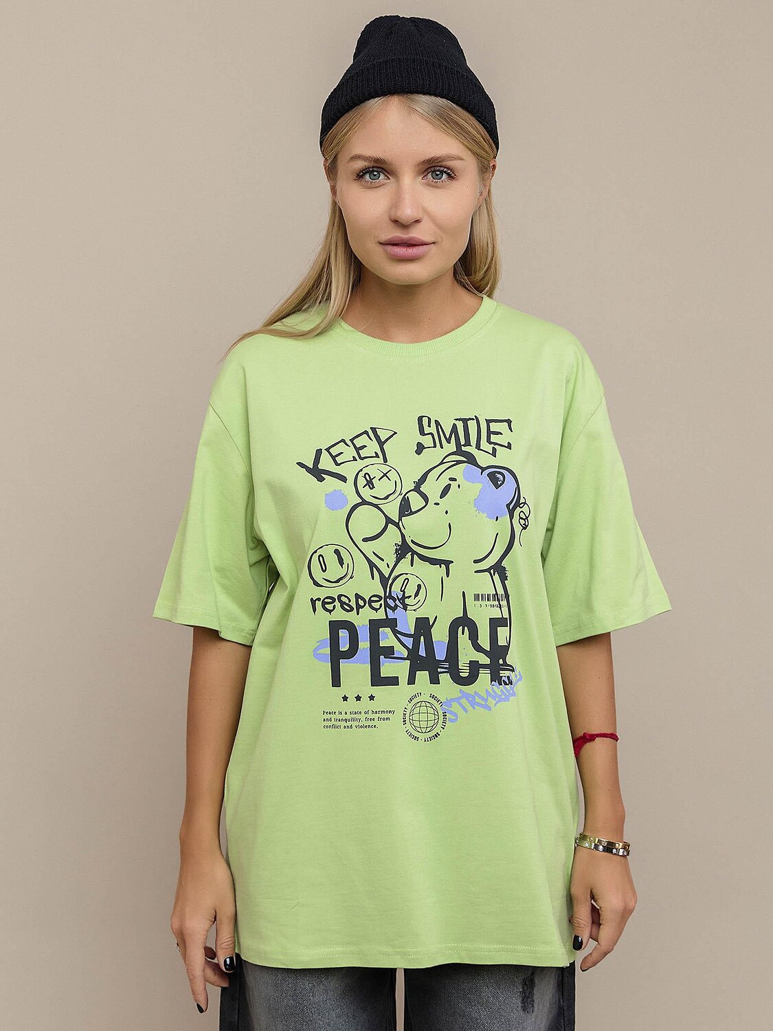 Футболка унисекс салатовая для детей и подростков с коротким рукавом из супрема пенье. Силуэт оверсайз, спущенный рукав, стильный принт. Подойдет для повседневной носки и активного отдыха. Изготовлена из ткани высокого качества.