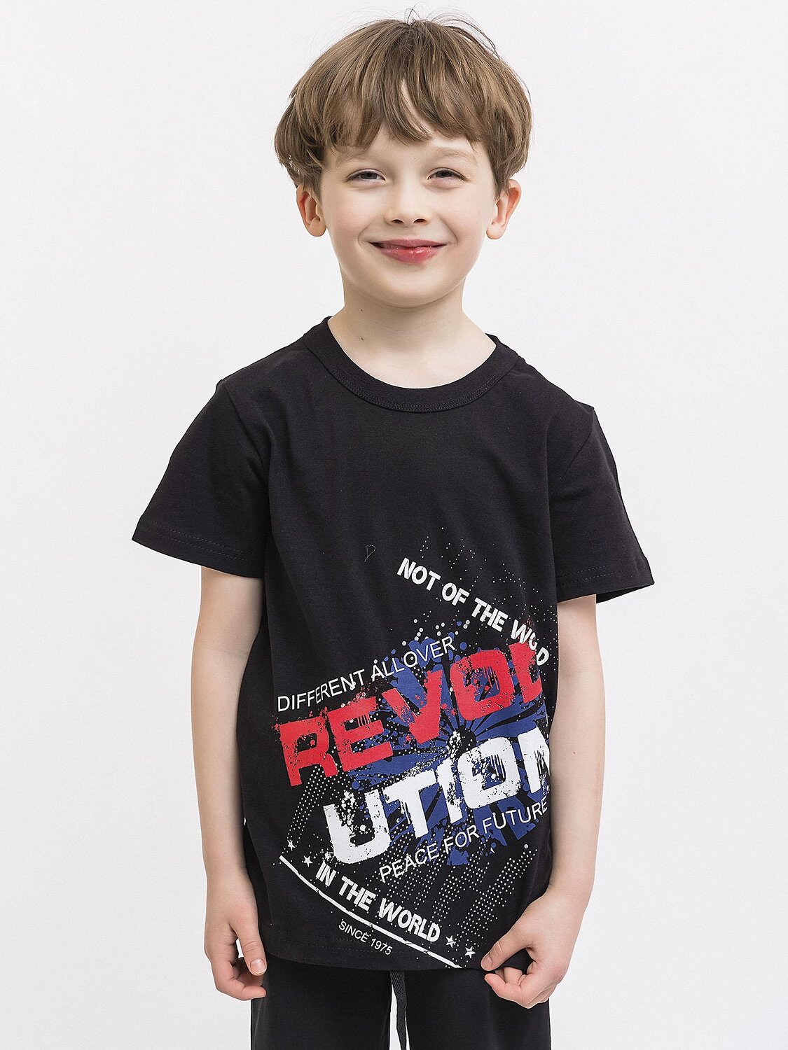 Футболка с коротким рукавом для мальчика из натурального хлопка. Классическая черная расцветка и принт с надписями. Круглый вырез горловины – удобная посадка, не натирает шею. Футболка идеальна для садика, прогулок и активных игр. Легко комбинируется с любой детской одеждой: брюками, шортами, джинсами.