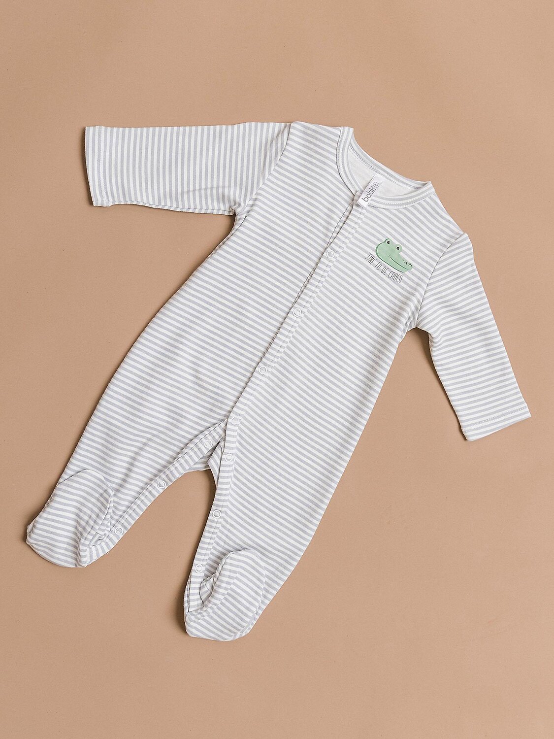 Комбинезон для мальчика трикотажный из интерлока. Практичный серый оттенок в тонкую полоску. Длинные рукава и закрытые носочки надежно защищают от прохлады. Удобная застежка на кнопках по всей длине – легко менять подгузник. Мягкий трикотаж не раздражает нежную кожу, позволяет ей дышать. Гипоаллергенные материалы, мягкие швы, удобная посадка.