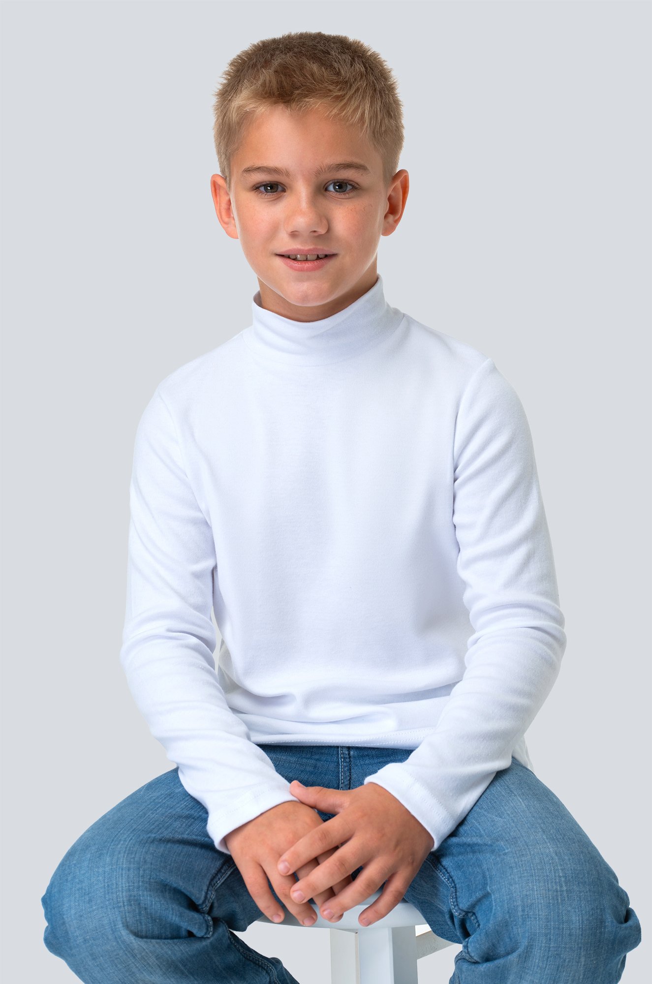 Белая водолазка для мальчиков и мальчиков подростков выполнена из 100% хлопка, который дарит запредельную мягкость и приятные прикосновения.