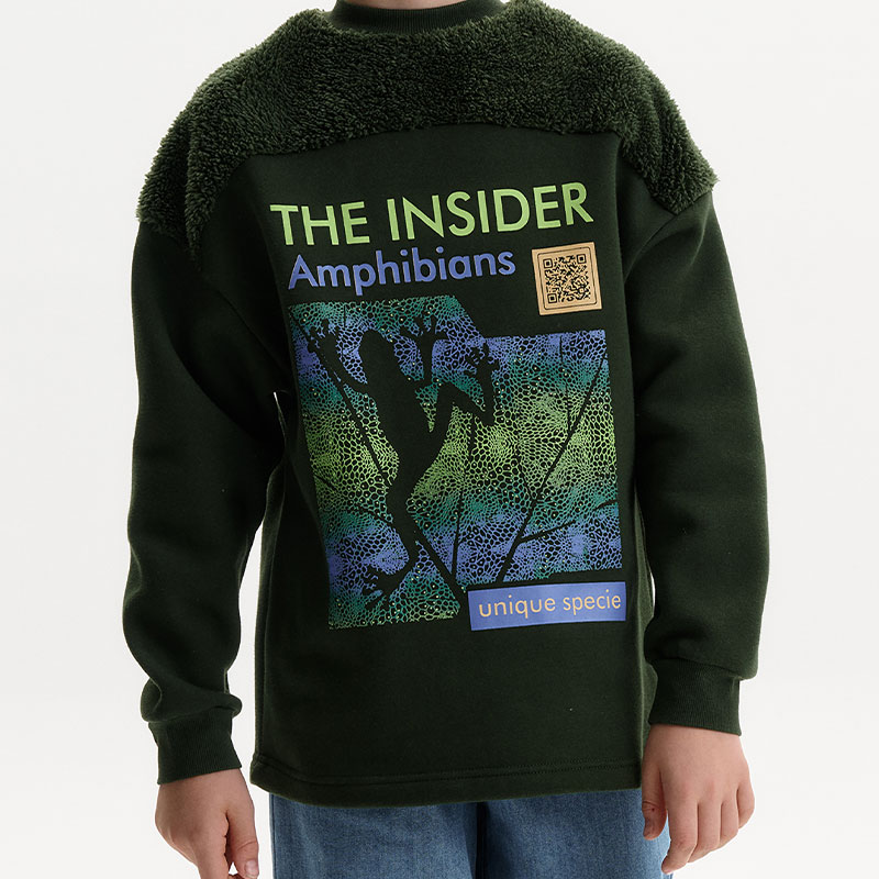 Состав: 60%хлопок 40%полиэстер, вставка: 100%полиэстерОписание: Свитшот детский для мальчика. Свободный джепер со спущенным плечом подарит ребёнку комфорт и не будет стеснять его движений. Объёмная толстовка выполнена в сочетании двух материалов: футера с начёсом и мягкого бербер-флиса (фактура «барашка») на кокетке переда и спинки. Комбинация материалов разной фактуры — актуальный модный тренд. Манжеты и отделка горловины выполнены из эластичной рибаны. Она не растягивается, прекрасно сохраняет форму, при этом ребёнку удобно надевать и снимать свитшот. За толстовкой просто ухаживать. Свитшот с принтом по переду выполнен из ткани с высоким содержанием качественного хлопка — он мягкий, тёплый и хорошо пропускает воздух. Полиэстер помогает сохранить цвет и первозданный внешний вид надолго. Оригинальный принт в виде лягушки с надписями «инсайдер амфибия» и «уникальный вид» дополнен QR-кодом, при сканировании которого можно прочитать уникальные научные факты о лягушках. Принт эластичный и прочный, не боится частых стирок. Свитшот с начёсом выполнен в универсальном цвете хаки. Оверсайз-свитшот подходит как для маленьких мальчиков, так и для подростков. Его можно носить круглый год: осенью и весной (демисезон), зимой, в прохладную погоду летом. Толстовка идеальна для детского сада, прогулок, активного отдыха, дома. Детский свитшот — отличный подарок сыну, брату, внуку или племяннику на Новый год и любой другой праздник.