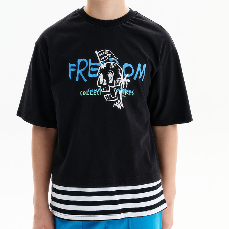 Состав: 100%хлопокОписание: Футболка для мальчика. Комфортная, умеренного оверсайз-объёма со спущенным плечом. Вырез горловины обработан эластичной рибаной (ткань в рубчик) — она отлично держит форму, не растягивается, при этом ребёнку удобно надевать и снимать футболку. Футболка с иммитацией многослойности за счет вставок по низу переда и спинки из материала в полоску. Перевод: Нет смелости — нет славы: Свобода: Коллекционируй приключения: Настоящий.